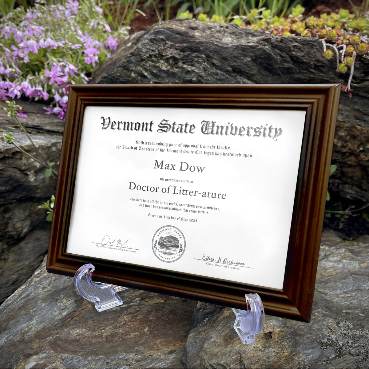 授予Max榮譽博士學位,為佛蒙特州立大學教職員的強烈認可,感謝牠4年來為卡斯爾頓校區為校園帶來許多歡笑、療癒全校師生。有趣的是,學校除了授予學位證書,還特別列出Max的「貓生4大智慧」: