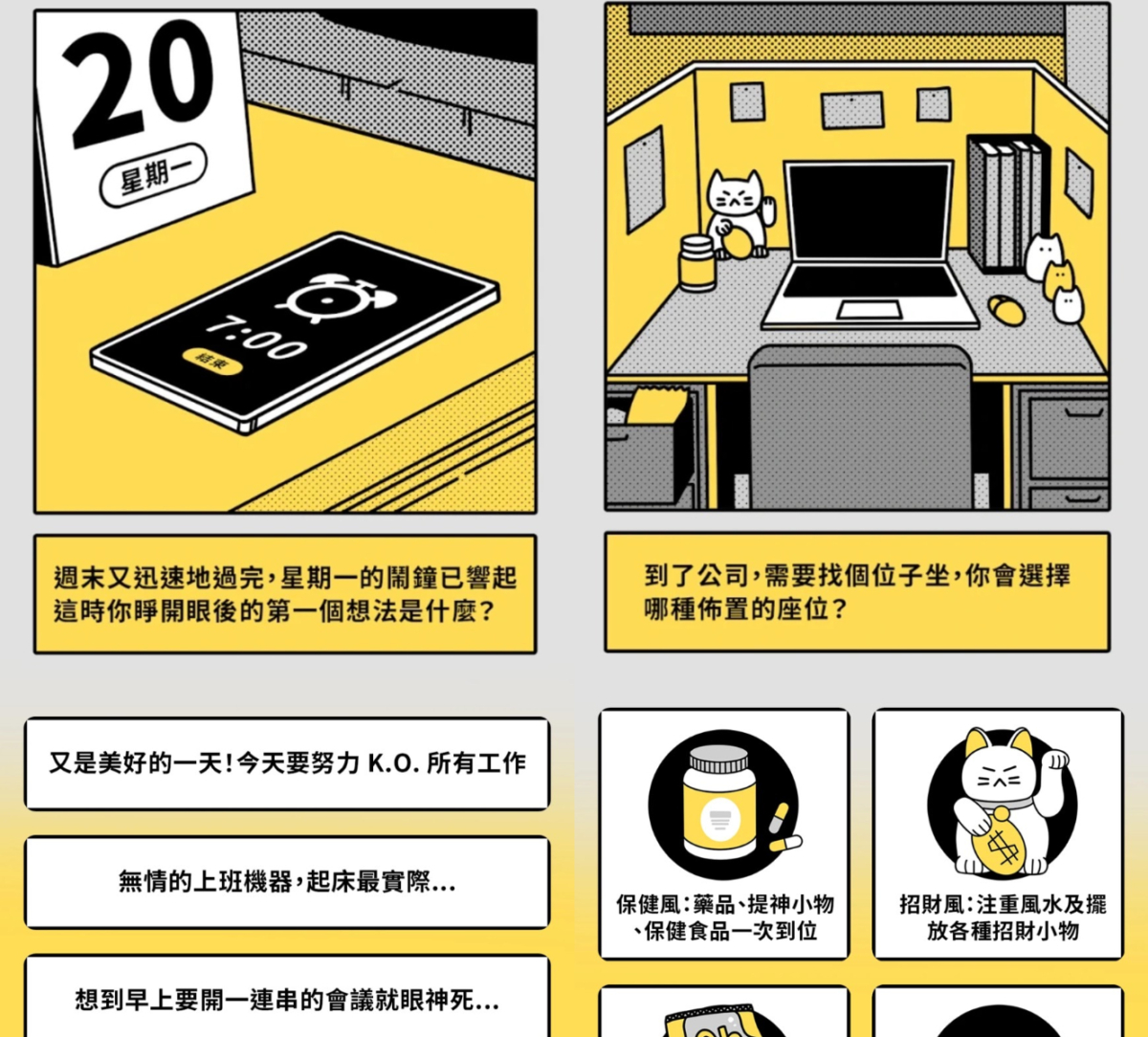 這款社畜運勢測驗由Nespresso咖啡攜手社群平台Dcard推出,超厭世畫風與問題都非常貼近辦公室日常。測驗共有5題,首先問到你起床上班的第一個想法,直接問出每個社畜心聲!再來就是辦公座位的佈置,真的不同個性就會有不同風格呀~