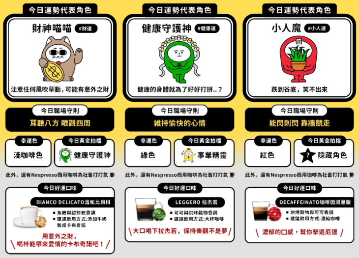回答完神還原辦公室場景的5道題後,便能出現運勢分析,主要結果包含財運、健康運、事業運與小人運等等,同時附上職場守則、幸運色、黃金拍檔以及對應的咖啡口味,提供給各位社畜們參考。編輯個人覺得非常準,但若遇到職場小人,真的是笑不出來……