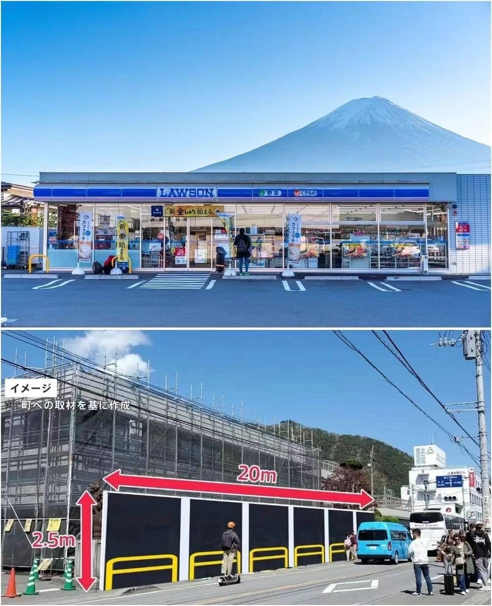 「LAWSON河口湖站前店」以平整方正的建築結構、藍白相間的日式招牌,配上背後的白頭富士山美景,成為觀光客的知名打卡勝地。不過,蜂擁而至的人潮同時也讓當地居民不堪其擾,包含亂丟垃圾、造成交通阻塞,甚至違規的商業行為等,因此居民們不得不採取最終手段,在當地架起一塊高2.5公尺、寬20公尺的黑色布幕來遮蔽美景,讓許多遊客感到相當可惜。