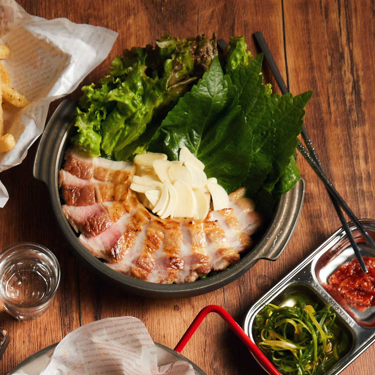 除了炸雞之外,店內也提供多樣韓式料理與小食,像是外酥內嫩的「炸韓式魚板」有著獨特口感和濃郁香味,不論是單獨食用還是搭配其他韓式料理,都能擁有不同的感受;或是「韓式五花肉」搭配秘製沾醬及新鮮蔥絲、蒜片,包著生菜、芝麻葉一同享用,口感堪稱完美!