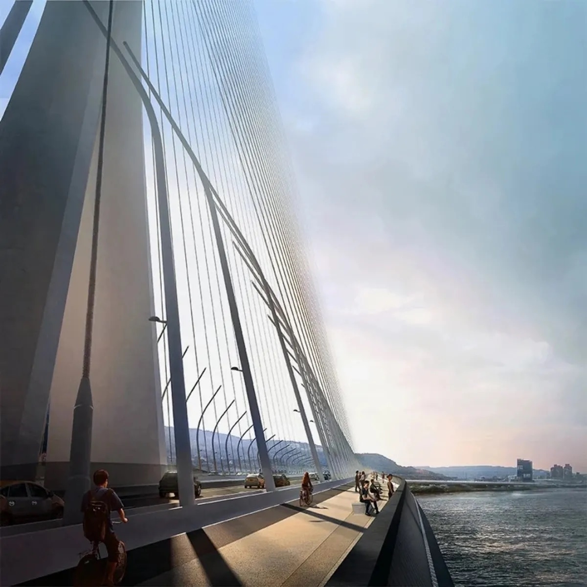 「淡江大橋」由已故建築女爵Zaha Hadid團隊與橋樑專家Leonhardt, Andrä und Partner合作設計,主橋塔高211公尺、全長920公尺、主跨距450公尺,總工程時間約68個月,完工後將成為世界上最大單塔不對稱斜張橋,令人相當期待它的到來!
