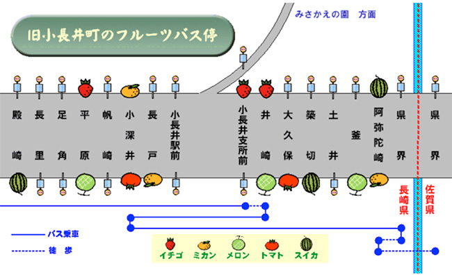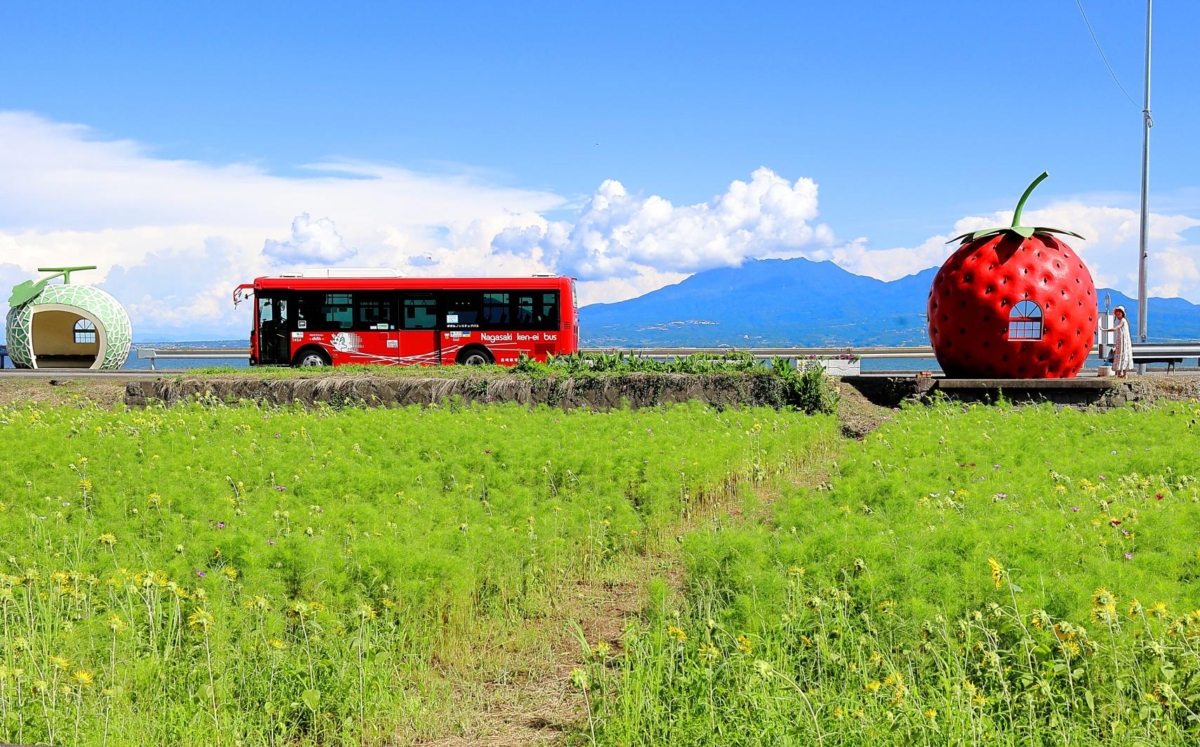 日本長崎縣因為氣候宜人、地廣平坦而盛產各種水果。為了推廣當地農產品,1990年長崎旅遊博覽會特別興建了一系列以水果為主題的公車站,靈感來自於《灰姑娘》中的南瓜馬車。這些公車站分別設計成哈密瓜、橘子、草莓、番茄和西瓜的形狀,沿著國道207號一字排開。經過多年的保護和翻新,這些公車站依然色彩鮮豔,成為了遊客眼中的奇景。