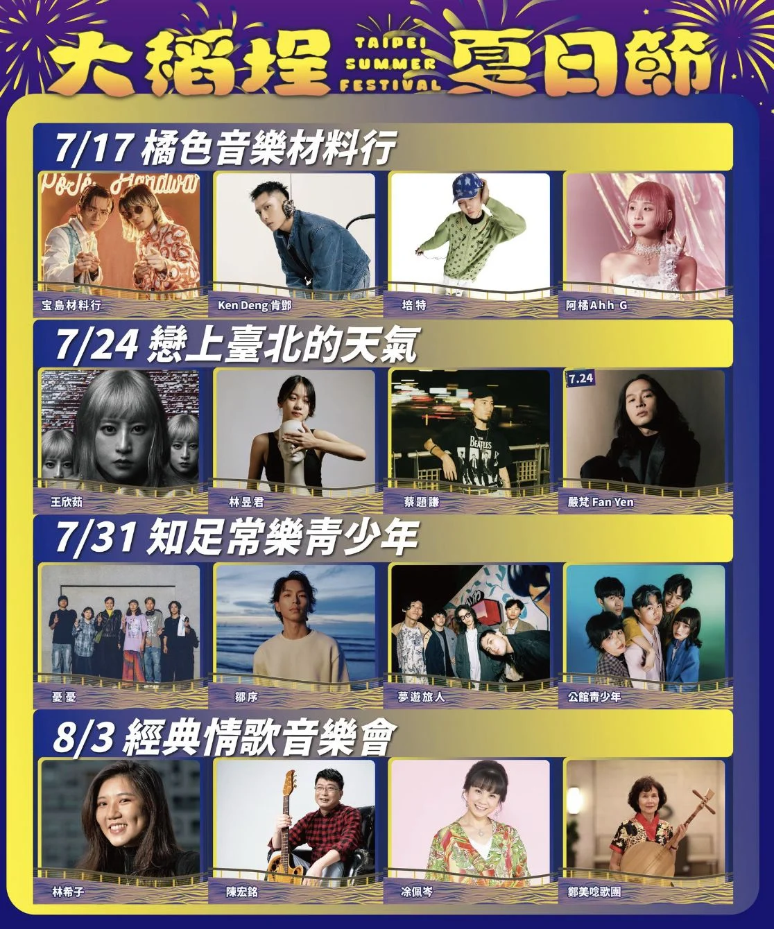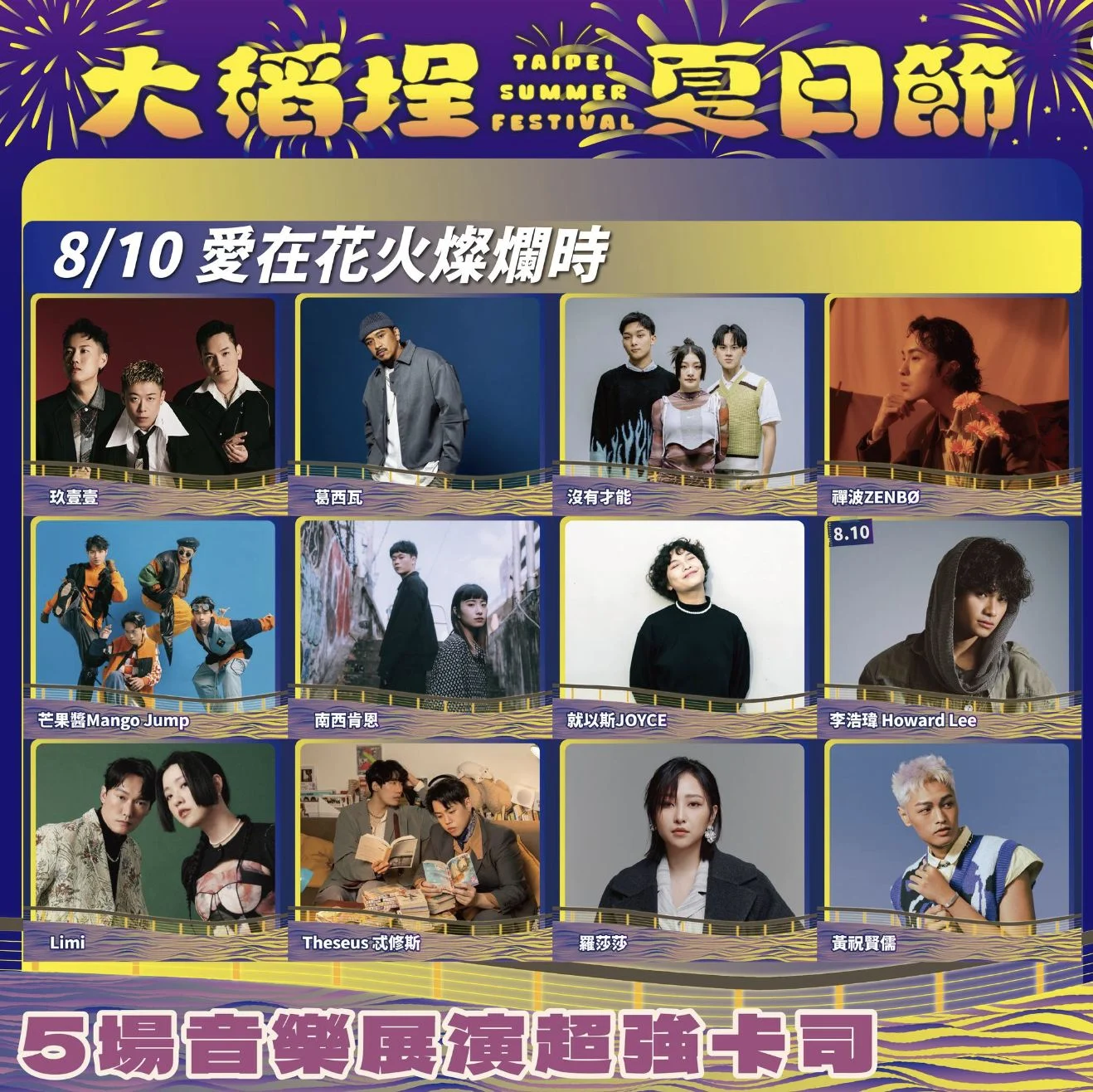 與煙火施放日期同天,7/17、7/24、7/31的舞台區將有歌手演唱,8/3在大稻埕永樂廣場還有經典情歌演唱會與限定文創市集。全部5場演唱會中,又以8/31邀請到最多組歌手,包含芒果醬、玖壹壹 feat.葛西瓦等等,一起嗨翻夏日夜晚!