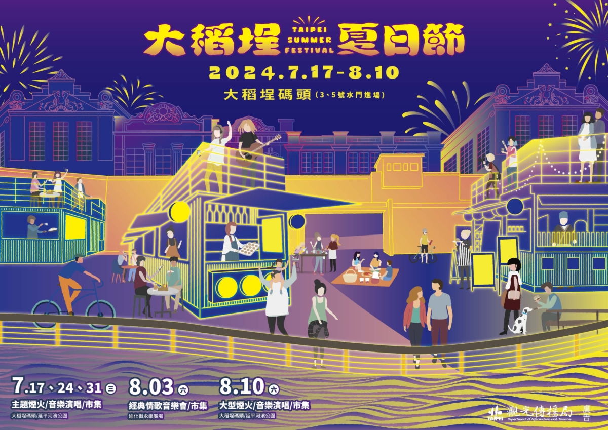 「2024大稻埕夏日節」共規劃3場300秒主題煙火秀以及1場480秒情人節煙火秀,分別於7/17、7/24、7/31與8/10(七夕情人節)的晚間20:00施放。同時也會邀請到多組藝人輪番熱唱,與大家一同享受夏日夜晚、浪漫熱情的情人節。