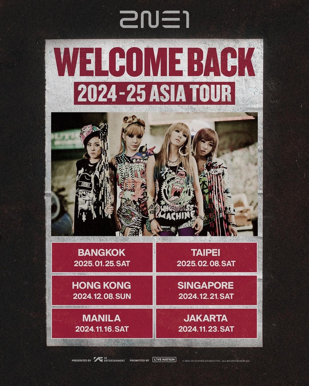 為慶祝2NE1出道15週年,經紀公司YG娛樂宣布今年10月起舉辦巡迴演唱會,首站首爾場於10/4~10/6三天開唱,帶來<I Love You>、<Lonely>、<Fire>、<I Am The Best>等多首經典歌曲,喚起大家的青春回憶、逼哭現場粉絲!之後會陸續在馬尼拉、雅加達、香港、新加坡、曼谷、台北開唱。
