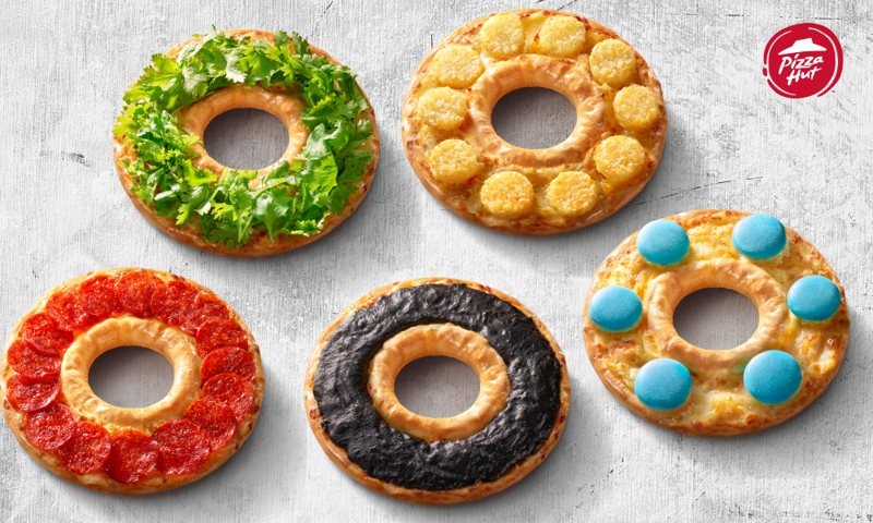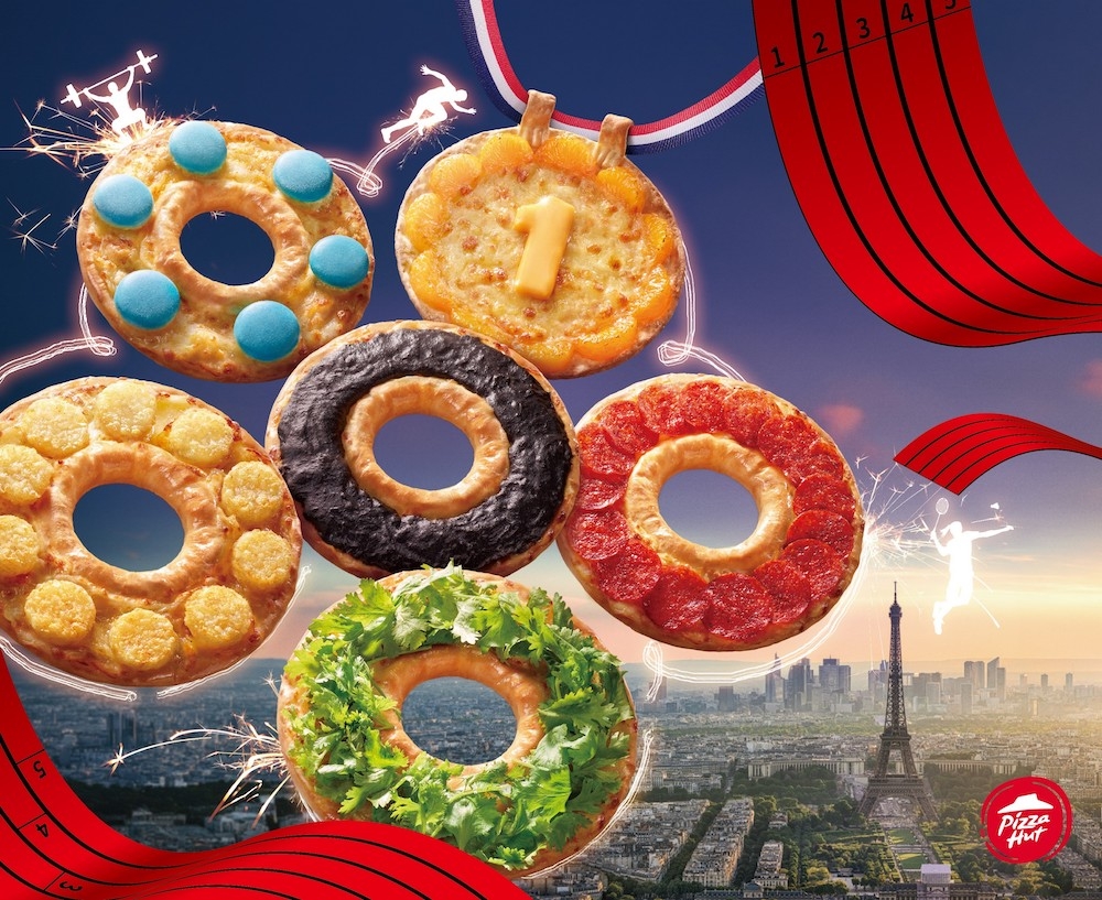 以奧運的五環為概念,必勝客使用招牌濃郁芝心餅皮,推出5種顏色比薩。口味包含「紅不讓臘腸」鋪滿美式臘腸,象徵著勝利長紅;「藍波萬馬卡龍」放上藍色法式馬卡龍,象徵永遠的NO.1;「勝綠高香菜」將愛恨兩極的香菜尬上燻雞絲,勝率在手;「黑皮芝麻奶蓋」期許選手如黑馬一舉奪勝;「好輝黃薯金幣」滿滿的薯金幣,代表奪金的光輝時刻。