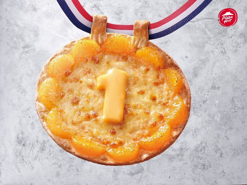 除了又鹹又甜、口味一個比一個還狂的五環比薩,必勝客還有另一款真的可以吃得金牌比薩!口味為「超桔金牌比薩」,將象徵大吉大利的桔瓣與金黃色起司結合,中間的「1」預祝中華隊選手都能奪金!