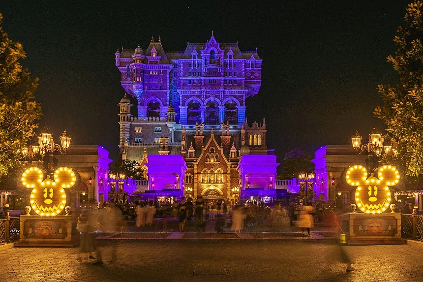 萬聖節期間,東京迪士尼將被萬聖節氛圍徹底改造。樂園入口處擺放著巨型米奇南瓜,周圍點綴著米奇和米妮造型的稻草人,而花園的路燈還能見到黑魔后、庫伊拉等反派角色的身影,讓人充分感受到節日的歡樂與詭譎。