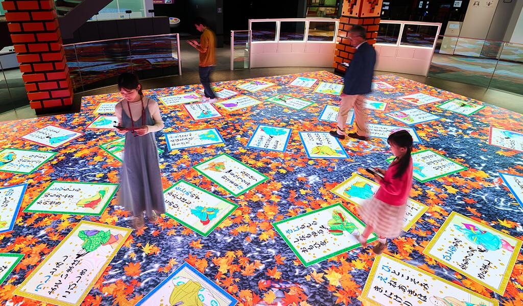 進入任天堂博物館,1樓以互動遊戲為主題,一共有8個體驗區,讓你透過現代科技重溫任天堂的經典作品。像是在巨型螢幕上使用手機體驗競技歌牌《百人一首》,或是在懷舊空間裡重溫「室內發球機」的棒球樂趣。