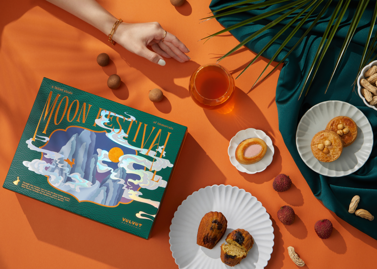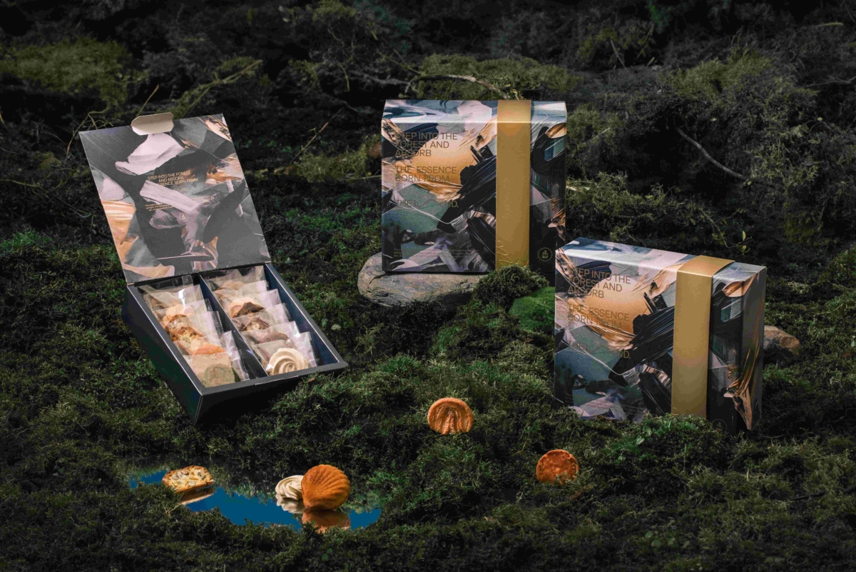 職人級法式甜點品牌法絨以台灣山水畫與現代藝術風格,打造「蓬萊中秋禮盒」,並嚴選本土頂級食材,推出蜜蘋無花果費南雪、荔枝烏龍瑪德蓮、鹹蛋黃杏仁酥餅等6款創新口味小點。