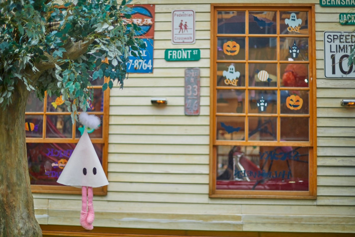 巫婆不在家時,小幽靈和搗蛋鬼可不會閒著!大樹上掛滿了蝙蝠和彩色小幽靈,隨風搖曳,營造出調皮童趣的氛圍。門口還有南瓜頭骷髏拿著糖果桶,準備隨時展開討糖遊戲,適合全家大小一起來玩~