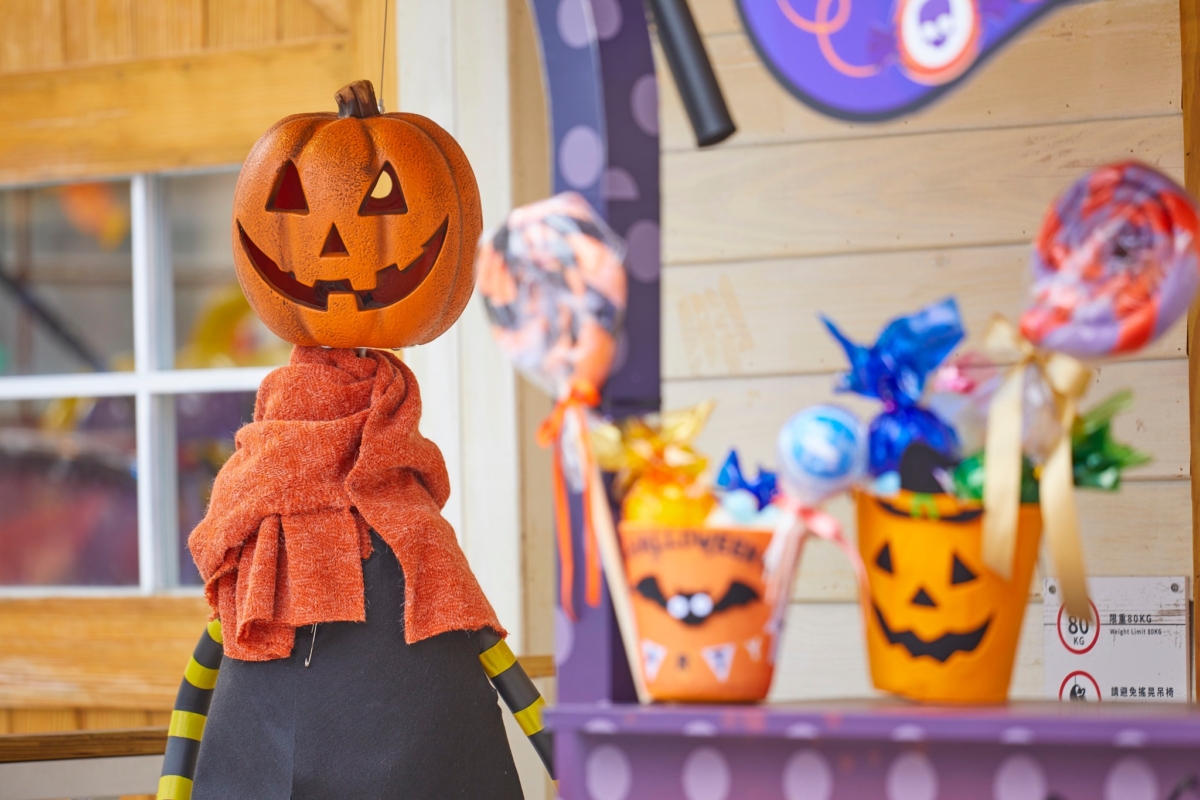走進巫婆怪奇工作坊,巨大蜘蛛佔據各個角落,巫婆的紅色敞篷車就停在一旁,被施咒的南瓜頭搖身變為專屬司機大哥。更有趣的是,彩色巫婆的腿高高懸掛在樑柱上,地牢裡的骷髏人試圖逃脫,讓毛骨悚然感加倍真實!