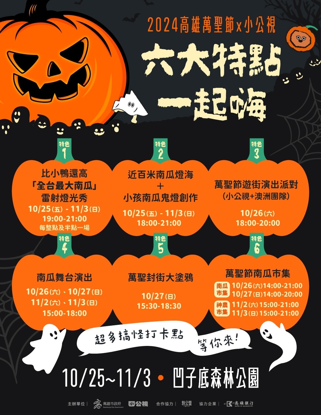 凹子底森林公園期間限定化身「萬聖節南瓜樂園」,展出高20米、寬22米的極巨化大南瓜鬼燈,打造全台最長南瓜燈海,還有遊街派對、市集等豐富活動。