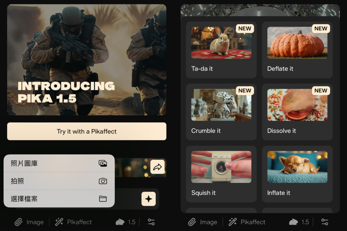 登入後,選擇下方的「Image」來上傳照片,接著點選「Pikaffect」,找到「Squish It」特效,並按下Squish It右方的十字星星圖案,讓網站開始生成你的黏土角色。