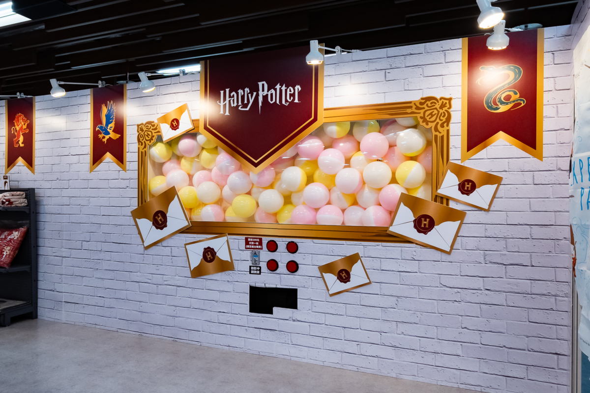 快閃店外牆上充滿「霍格華茲經典元素」,一旁的「窗台區」能夠瞥見店裡景象,接著往內走,柱子上還掛著霍格華茲四學院的「學院旗區」;「霍格華茲城堡」有四學院代表動物的圖像;最後別忘了來到「入學通知信」大扭蛋區,準備試手氣把大獎扭回家!
