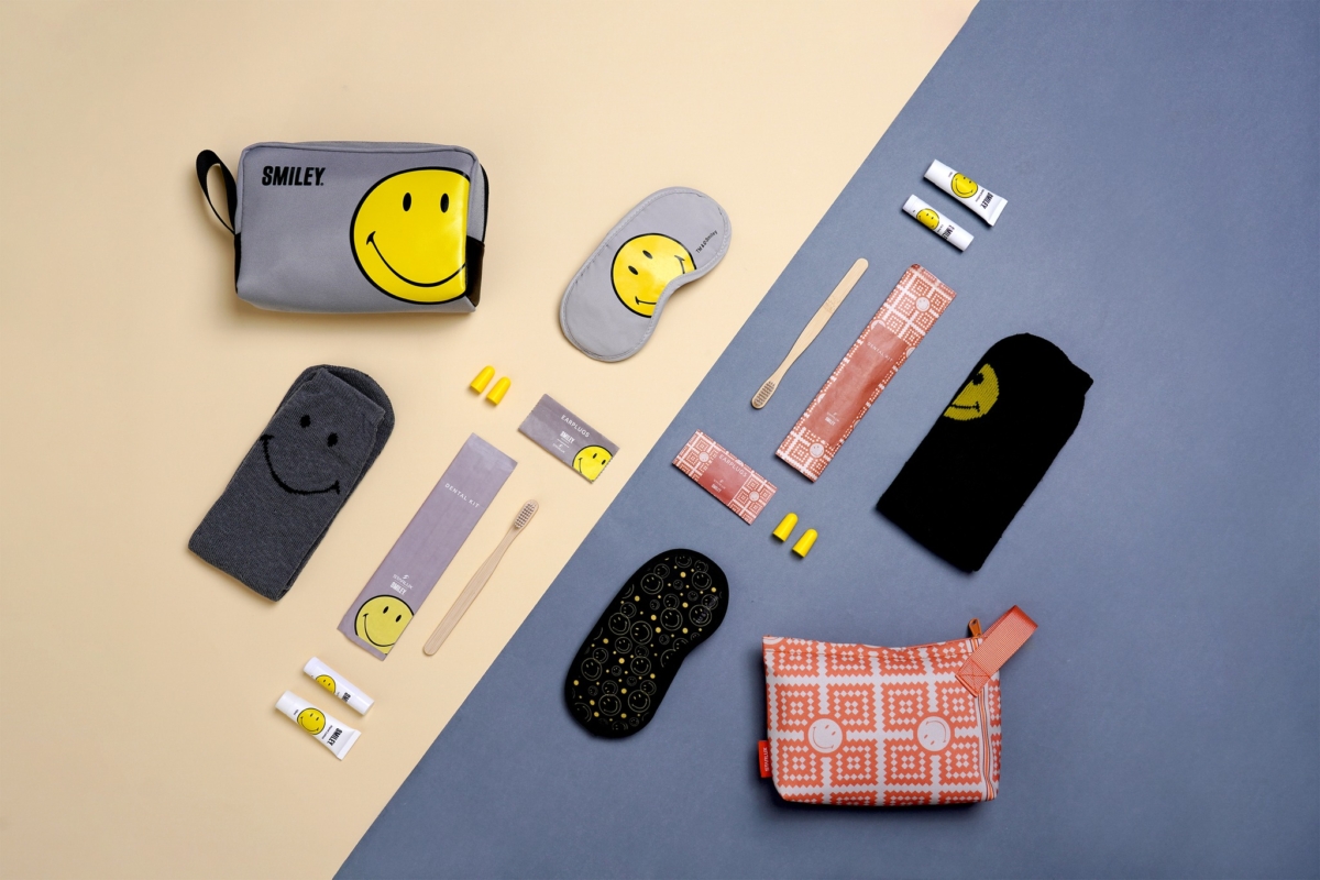 來到豪華經濟艙,黃色笑臉SMILEY首登高空,帶來年輕、充滿活力的能量氛圍。過夜包內容包含護唇膏、護手霜等護膚用品,皆印有品牌招牌笑臉圖案,心情不自覺跟著愉悅~來回旅程發放不同過夜包款式,直接收入兩款設計,物超所值。