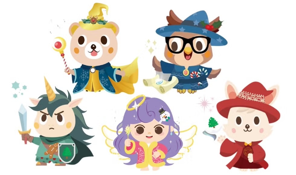 魔幻天使以及他的4位朋友們小客熊(元素探索者)、貓頭鷹(祕法智者)、兔子(靈魂治療師)、獨角獸(聖盾守護者),邀請大家一起來體驗一場充滿耶誕氛圍的魔幻旅程。