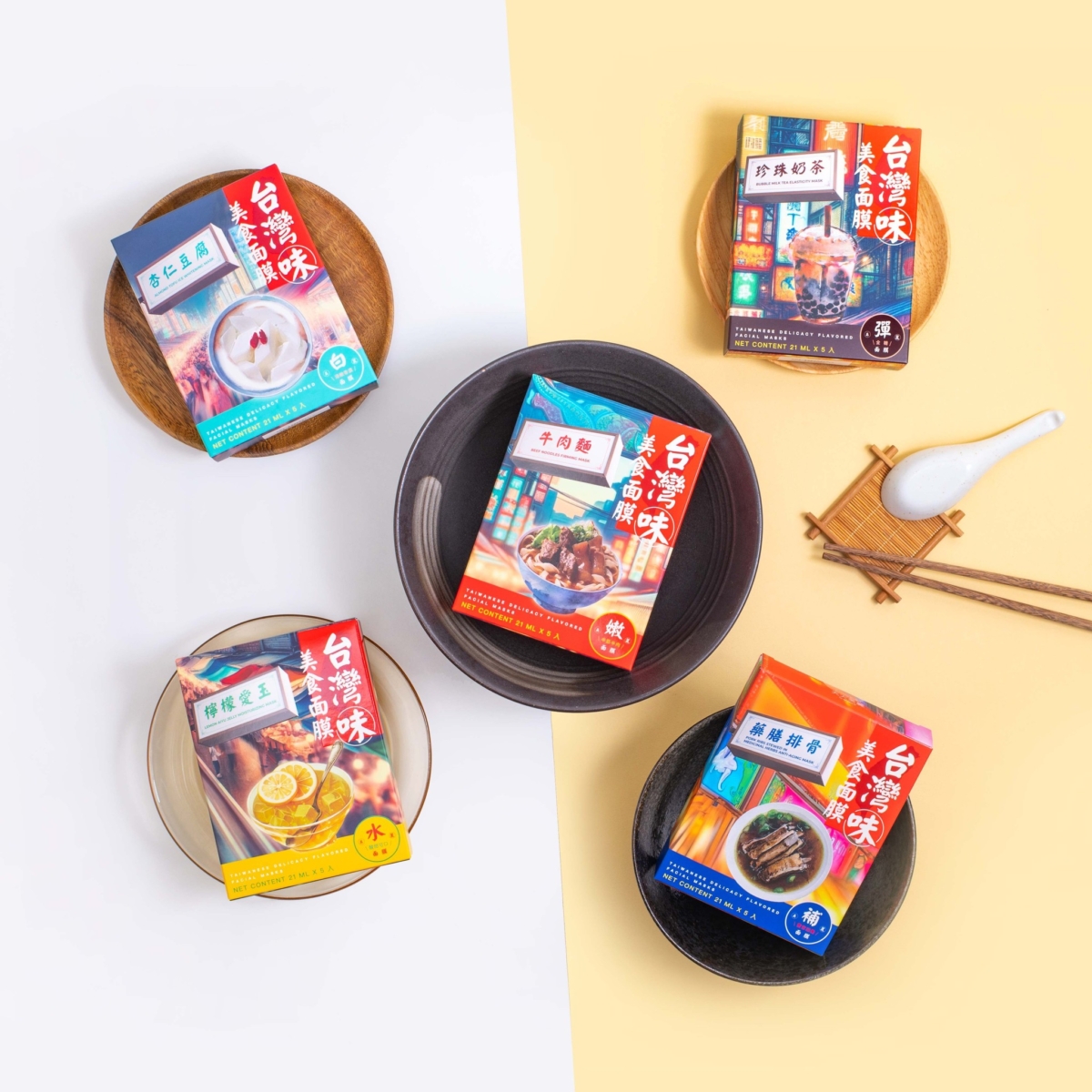 提到台灣最具代表美食,怎麼能沒有擄獲男女老少的珍奶~「珍珠奶茶彈力面膜」將益生康普紅茶搭配黑糖及茶香調和,增加肌膚彈性、補充水分。「檸檬愛玉保濕面膜」以檸檬和蜂蜜調味還原酸甜滋味,可加強肌膚保濕力,提升光澤度。「杏仁豆腐冰美白面膜」打造如豆腐般的白嫩肌,平滑緊緻肌膚。