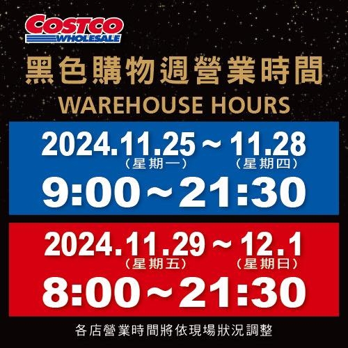 2024台灣好市多「黑色購物週」期間為11/25~12/1,活動期間賣場將提早營業至上午8點、9點開始,各店營業時間將視實際情況調整。另外,即日起12/1,好市多會員首次使用線上購物消費金額滿$3600元,輸入優惠券代碼24aloha2即可獲得$300元折抵。