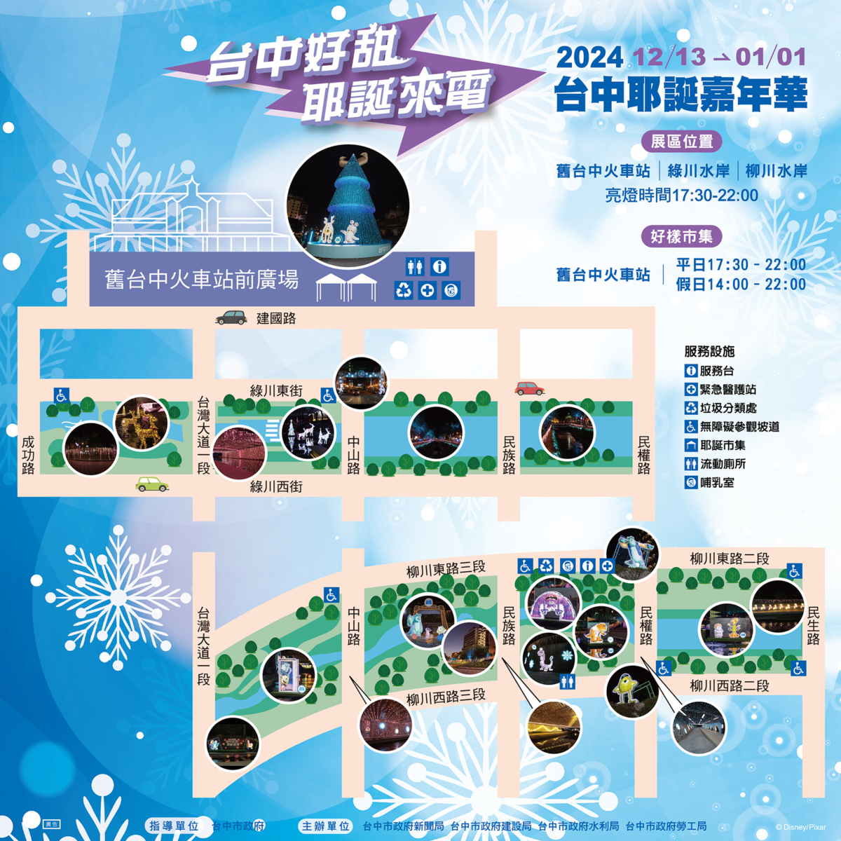 今年台中耶誕嘉年華首度攜手《怪獸電力公司》,以「台中好甜 耶誕來電」為主題,展區遍布舊台中火車站、綠川水岸及柳川水岸,毛怪蘇利文、大眼仔麥克華斯基、阿布人氣角色都現身台中街頭,以繽紛的模樣陪伴大家歡慶過節。