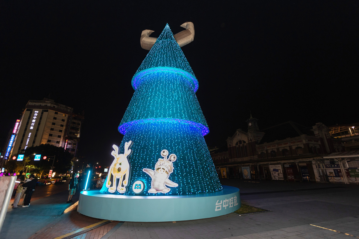 在舊台中火車站前廣場,最吸睛的便是全台唯一、高達16米的毛怪造型聖誕樹。以毛怪蘇利文獨特的藍紫色毛皮為發想,特別設計出毛絨絨的聖誕樹,樹頂還有雙角裝飾,超級可愛~底下還有大眼仔及阿布陪伴,皮克斯粉絲一定要到此打卡拍照!