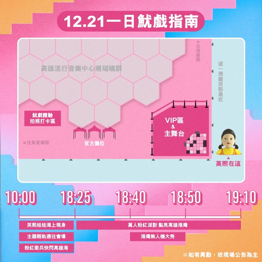 除此之外,在12/21活動當天,還有一場長達近10分鐘的《魷魚遊戲》無人機大秀,透過多樣變化的演出,不僅呈現《魷魚遊戲》經典畫面,更同時暗藏第2季劇情線索。影迷們趕緊化身「粉紅守衛」,參加愛河灣專屬的萬人粉紅派對!