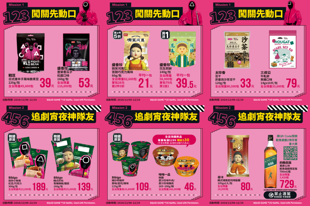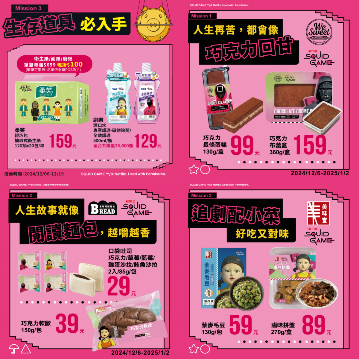攜手近20款品牌商,全聯推出一系列《魷魚遊戲2》聯名包裝,例如Bibigo、盛香珍、味味一品泡麵、柔芙衛生紙、口袋吐司等等,其中威士忌巧克力蛋糕、巧克力布蕾盒更是大受好評。即日起到明年1/19,在台北信義區香堤大道還設有限定攤位。