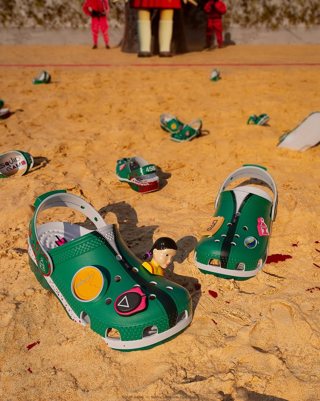 幾乎每個韓國人都有一雙的CROCS洞洞鞋,經常會攜手各大IP推出聯名款式,這次《魷魚遊戲2》當然也不能錯過~以劇中的綠色運動服設計,甚至還有血跡……更能搭配英熙娃娃、椪糖與紅衣人鞋扣。