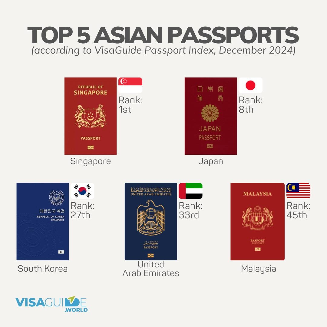 次於新加坡及日本,另外表現亮點的亞洲護照還有南韓第27名、阿聯酋第33名、馬來西亞第45名,為亞洲前五名。至於台灣護照在本屆以69.46分位居第69名,在100個國家地區免簽、29國落地簽、40國電子簽證,雖然未能擠入前五,但對大多數旅客已是綽綽有餘。