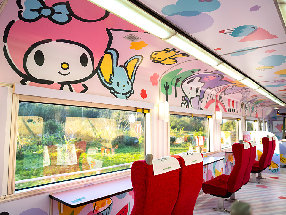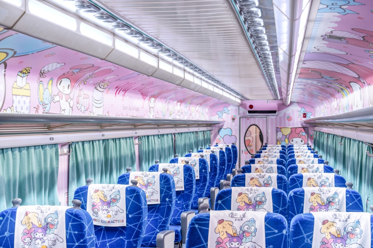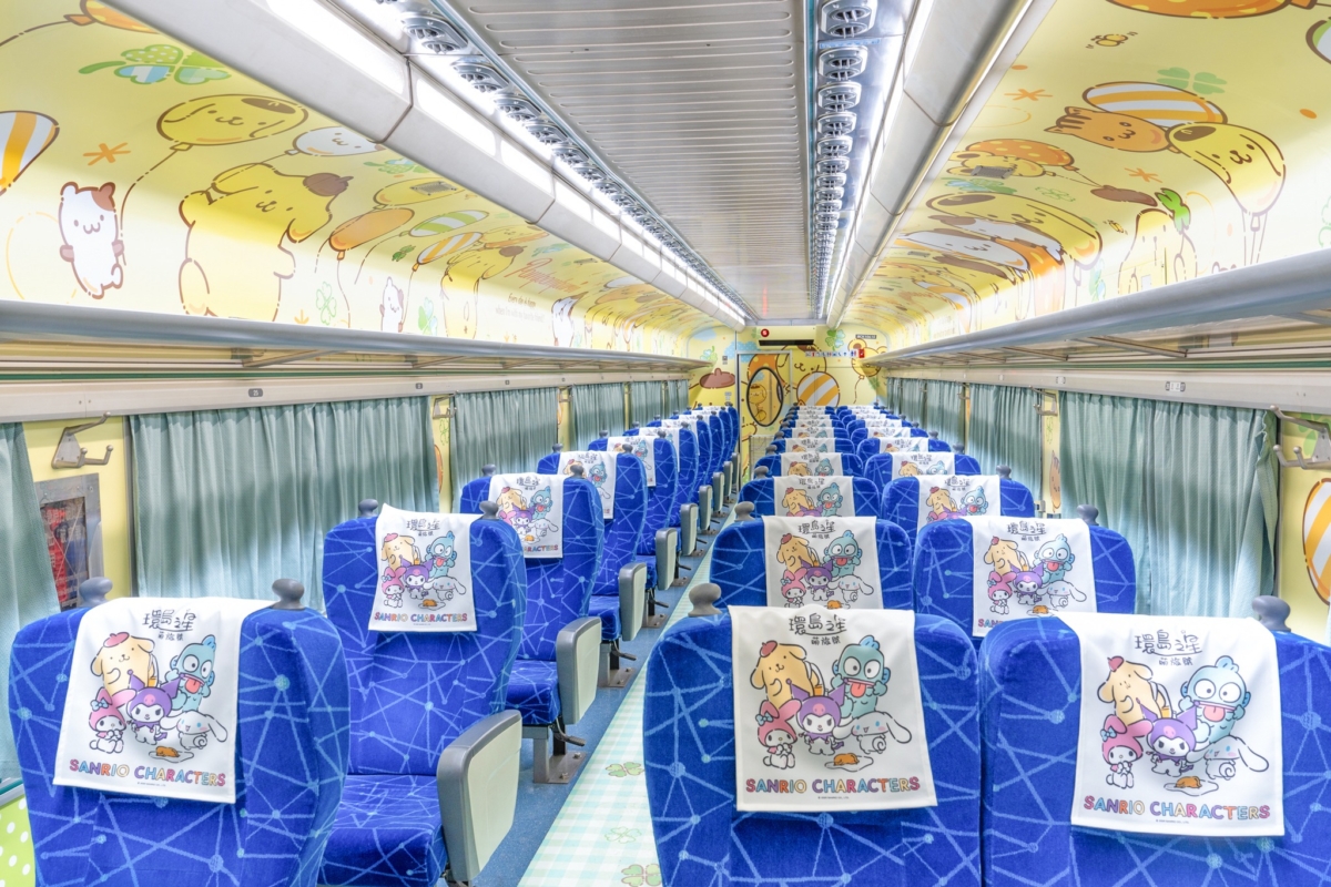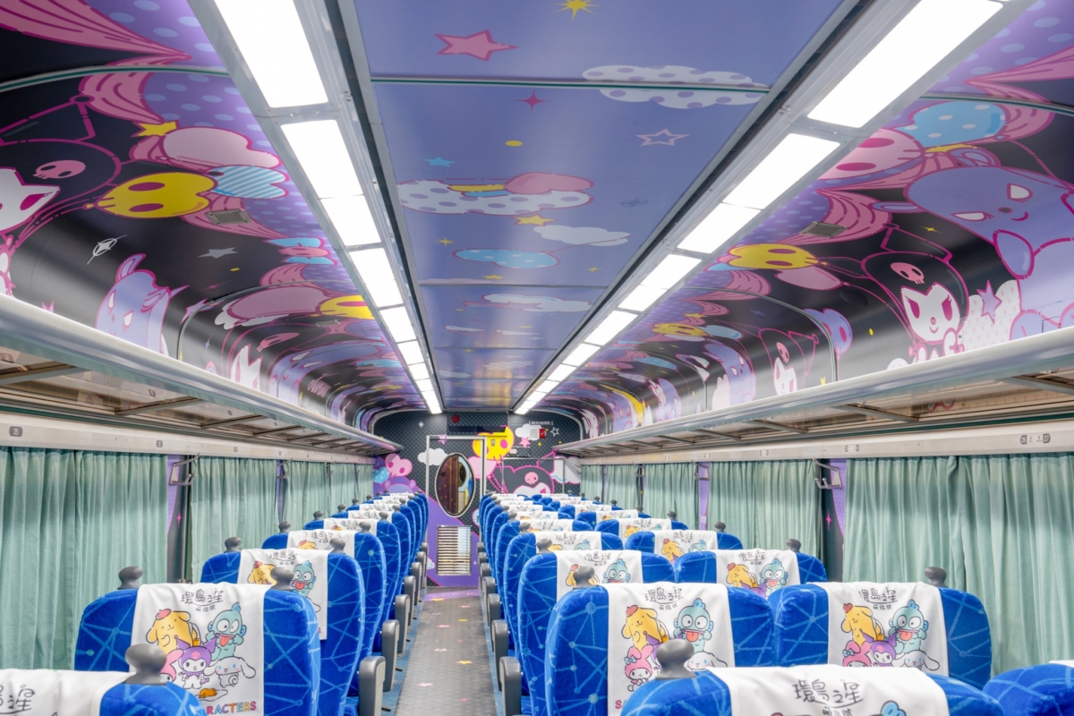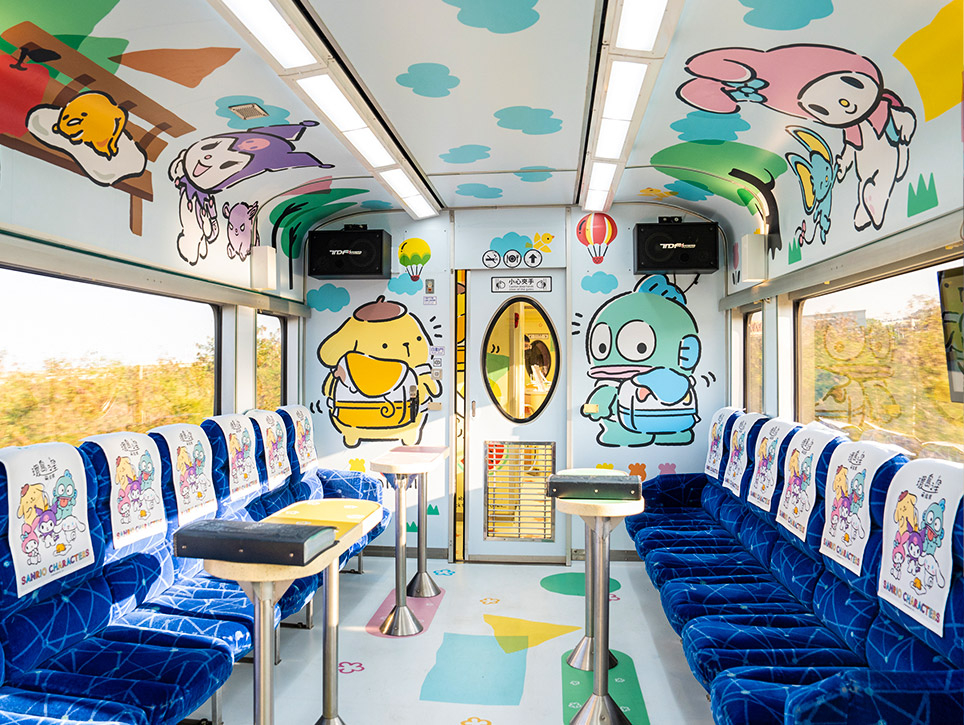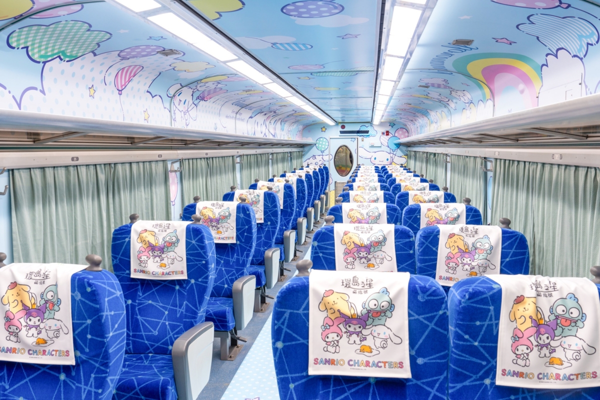 最後一節商務車廂則配備豪華座椅,整體空間寬敞舒適,讓搭乘體驗更加分!列車共有美樂蒂、酷洛米、布丁狗及大耳狗共4款不同彩繪主題,搭配各式各樣的台灣元素設計,讓你在旅途中每每搭乘都有驚喜!
