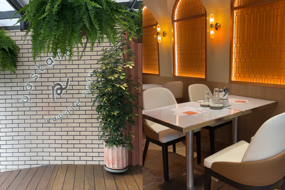 走進pastaio noodle café,映入眼簾的是銅珍珠色拱門、大理石桌面、蓊綠植栽,時尚又溫馨的設計,讓人一坐下就感覺放鬆。而戶外露天座位區則是被滿滿綠意包圍,無論是陽光灑落的早晨,還是微風輕拂的午後,都能感受最愜意的氛圍。