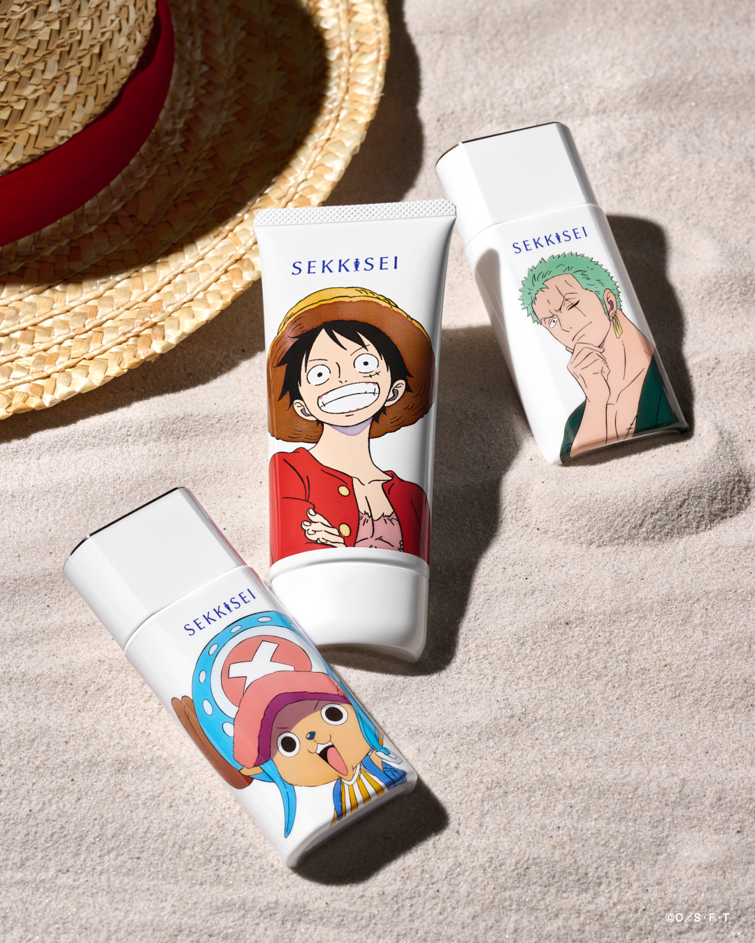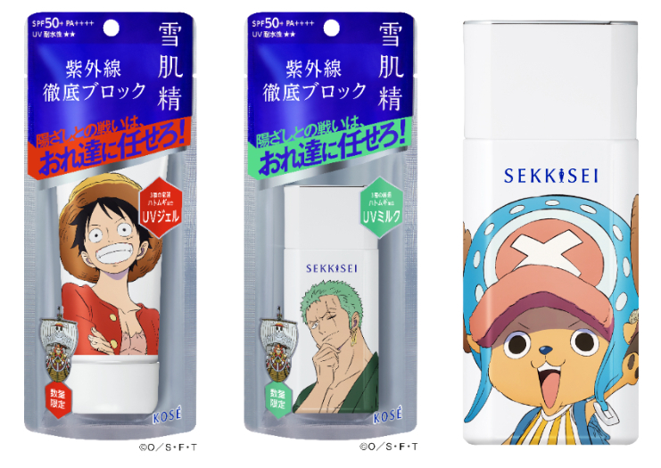 專櫃限定《雪肌精 輕水感UV防曬凝膠》與《雪肌精 輕水感UV防曬乳》,選用魯夫與索隆作為瓶身設計。內含三種薏仁配方,不只抵禦紫外線,還能保濕、美白、修護,讓肌膚在防護同時也變得更透亮。開架通路推出喬巴瓶身的《雪肌精漾活低敏UV全效防禦乳》,一起展開冒險旅程!