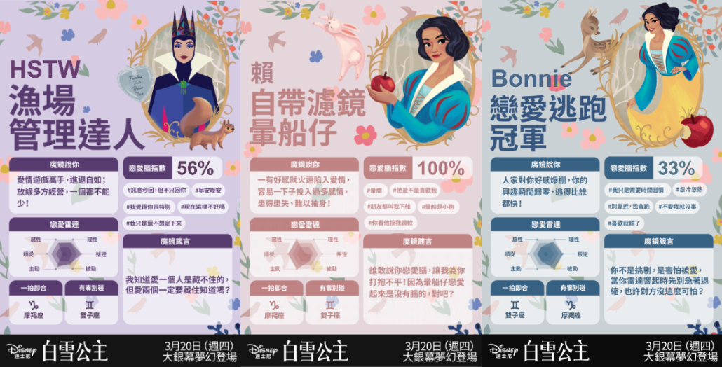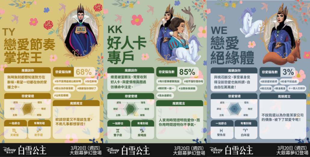 迪士尼《白雪公主》真人版電影將於3/20台灣上映,雖然之前在選角上有些許爭議,但還是讓粉絲們非常期待。而為宣傳電影,迪士尼推出超有趣的《白雪公主》心理測驗,只要簡單回答幾道題,就能測出你在戀愛中是什麼類型與戀愛腦指數,各位暈船仔可要注意啦~