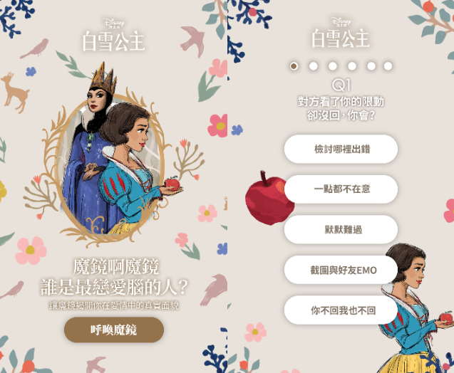 白雪公主經典台詞:「魔鏡啊魔鏡,誰是世界上最美的人?」讓人印象深刻,但在此心理測驗則變成「誰是最戀愛腦的人?」並分成6道題目,都是大家在曖昧中或戀愛中可能會遇到的情境,最後根據不同選擇得出自己在愛情中是什麼樣的人,讓魔鏡揭開你的愛情面貌!