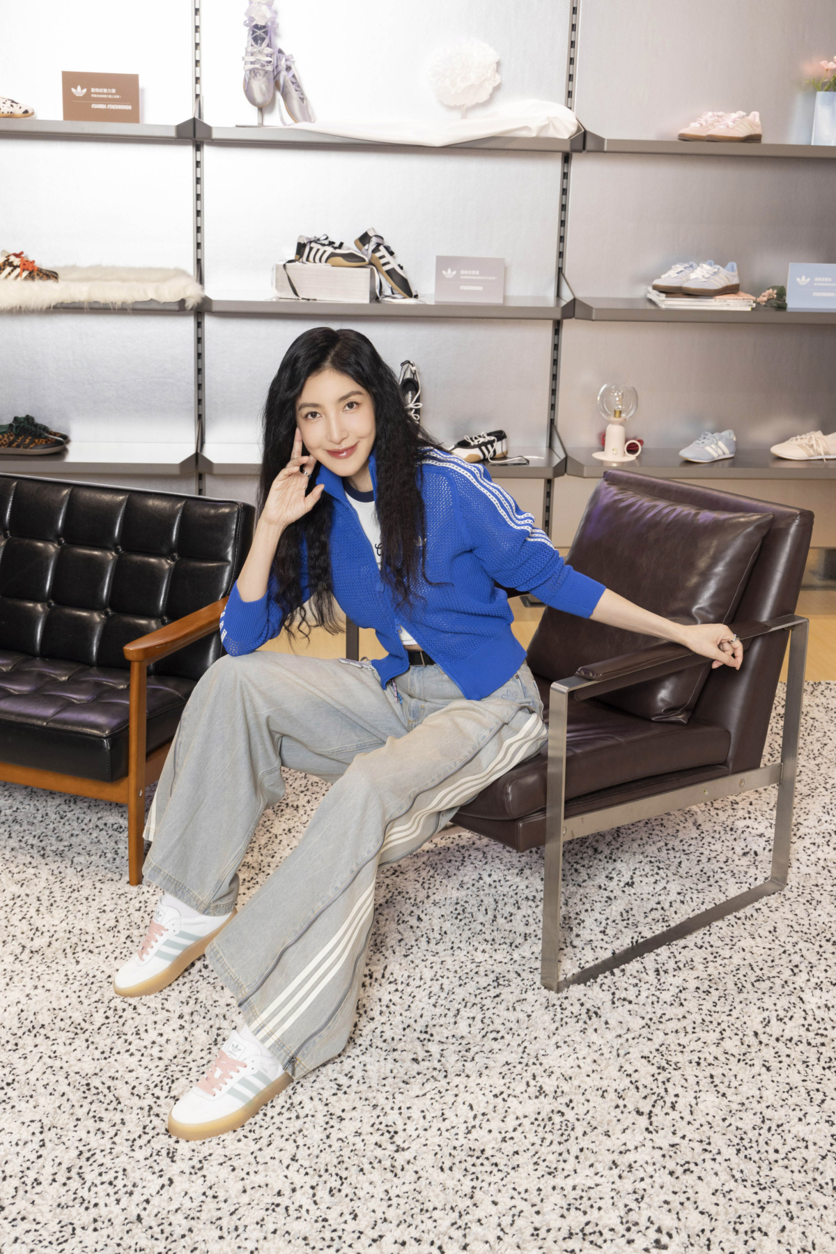 影后楊謹華化身復古女王,藍色鉤針編織外套+米白T-shirt+水洗牛仔褲,玩轉復古與高街風格!Samba厚底款湖水綠X白色鞋履成為亮點,展現極簡卻搶眼的時尚魅力!
