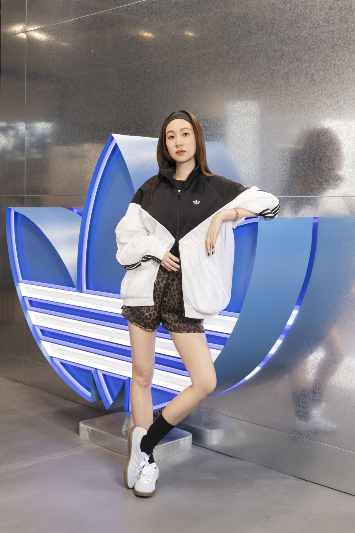 潮流教主Melinda選擇黑白撞色運動外套,搭配豹紋短褲與直條紋背心,腳上的GAZELLE寶寶藍鞋款為造型增添清新春天氣息,簡單穿就很有態度!