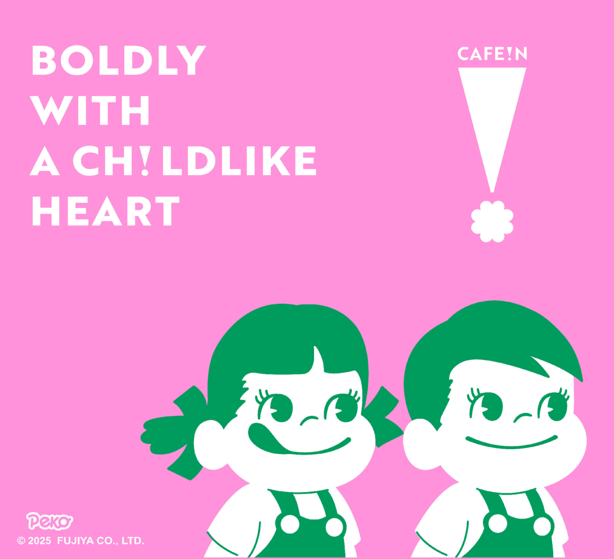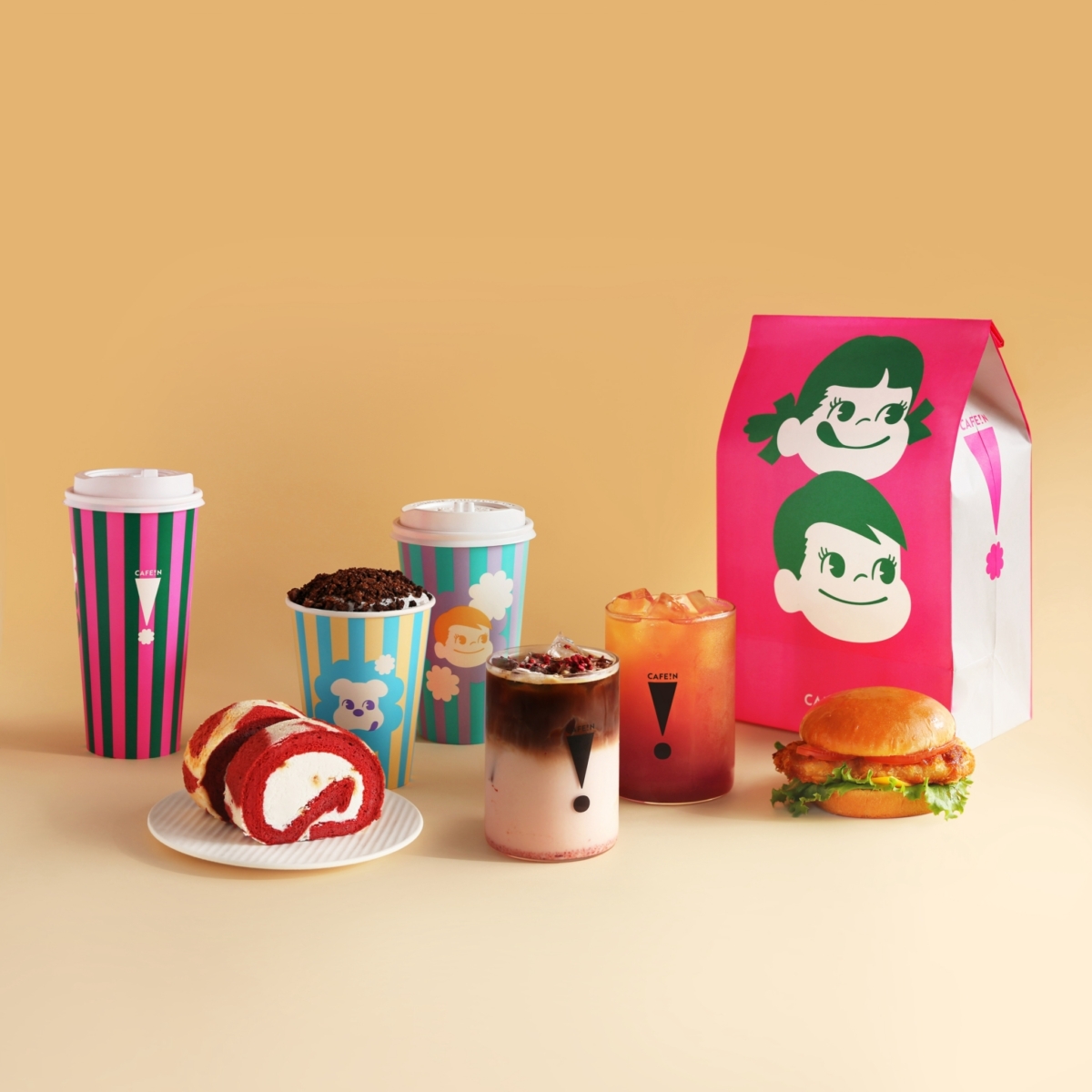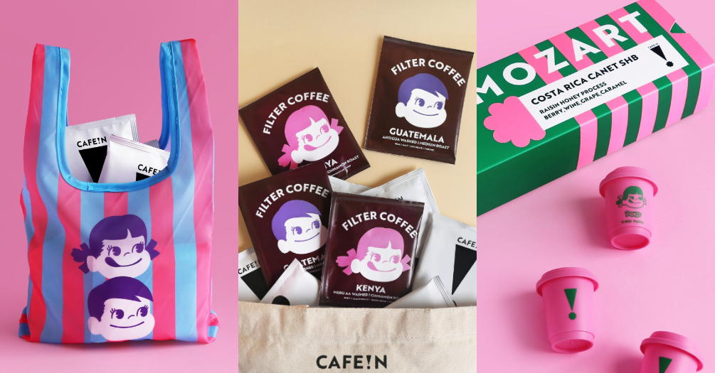 PEKO最早於1950年以不二家洋菓子店的店頭公仔身份亮相,本次與CAFE!N的聯名一改過往的用色風格,使用大量螢光色、撞色、亮色與炫光設計,包含杯身、紙袋與各式周邊,將回憶中牛奶糖糖果紙上的小花朵提取出來,PEKO、POKO變得更可愛時髦,同時又充滿童趣。