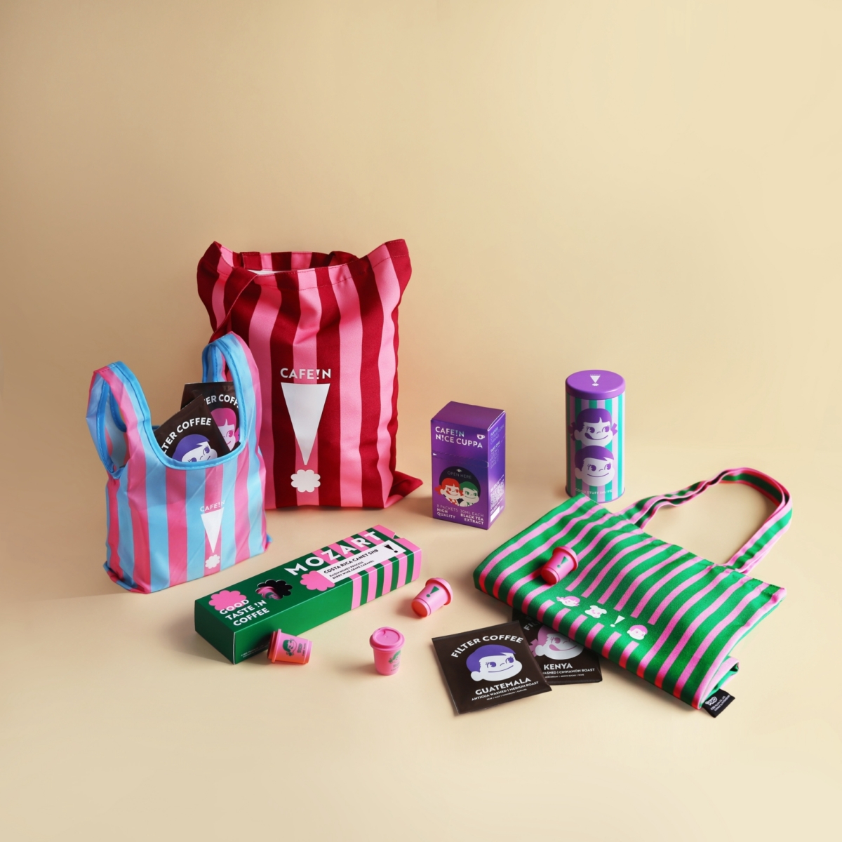 CAFE!N全新推出「哥斯大黎加 莫札特蜜處理 凍乾咖啡」,搶眼的粉紅色杯身,根本讓人不得丟~同時濾泡咖啡與樂萃紅茶也有聯名包裝。至於周邊的部分則有環保袋、帆布包與多功能儲物罐,其中必收「PEKO迷你環保袋」,復刻水果攤半斤花袋,藍紅色非常有台灣味!