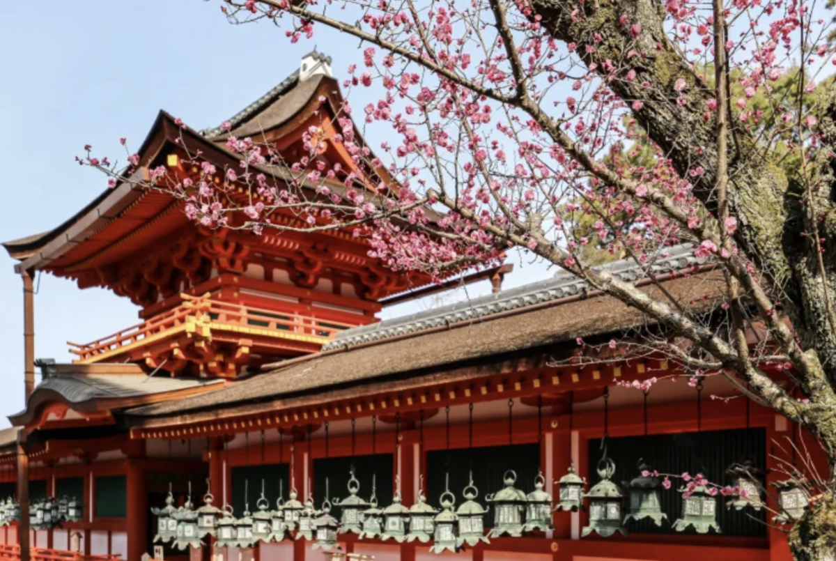 奈良公園佔地遼闊,賞櫻景點首推座落於鷺池上的「浮見堂」,湖面倒映著花朵與建築,燈光的夜櫻更添浪漫氛圍;當地著名的「東大寺」前廣場種植許多櫻花樹,與雄偉的大佛殿相映;「春日大社」的參道兩側種滿櫻花樹,搭配古老石燈籠與神社建築,非常適合另一半在此漫步超浪漫!