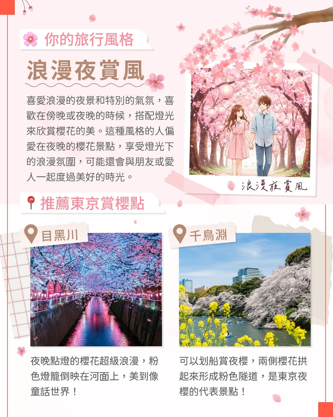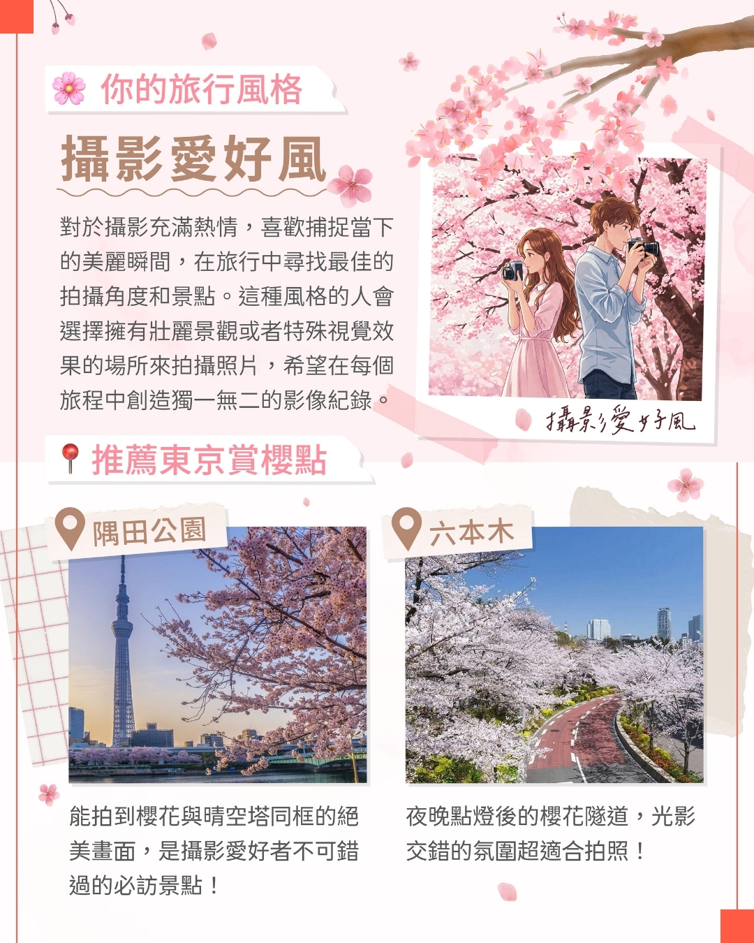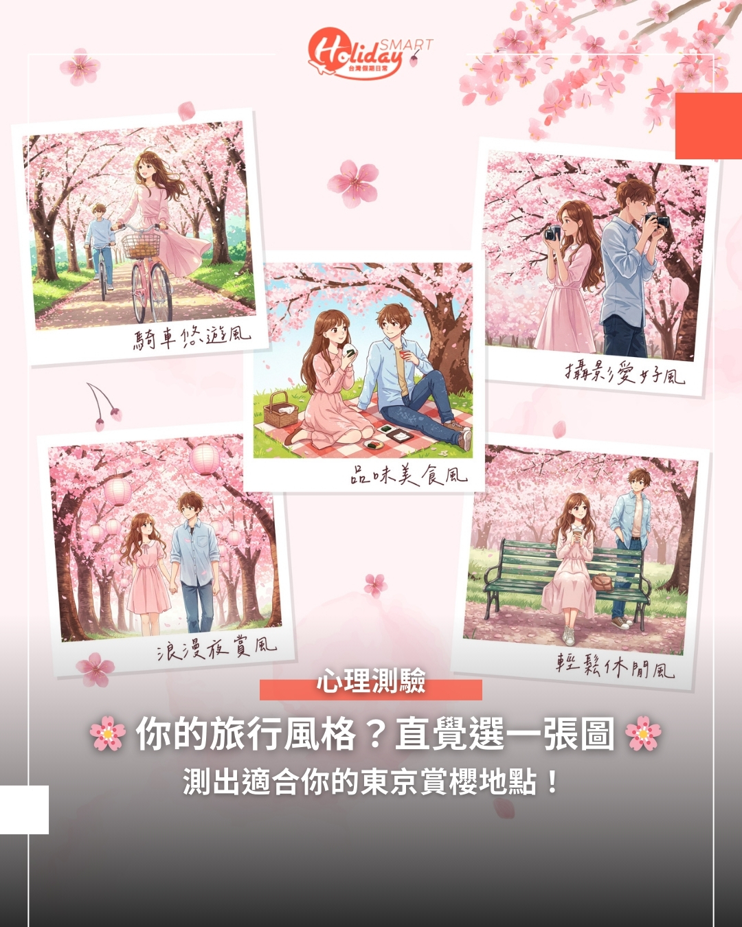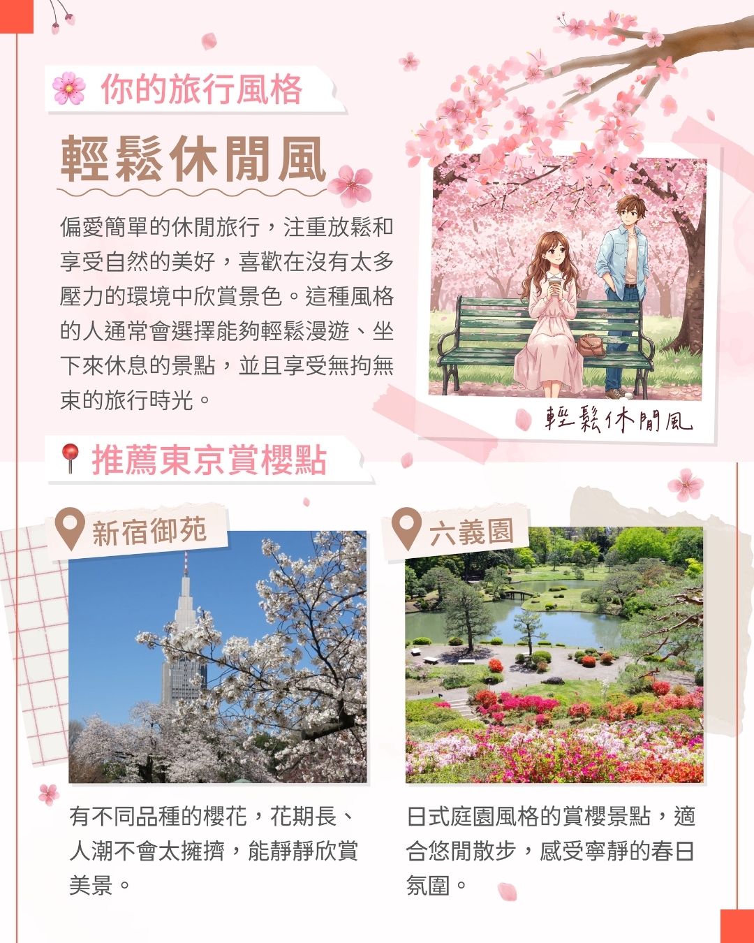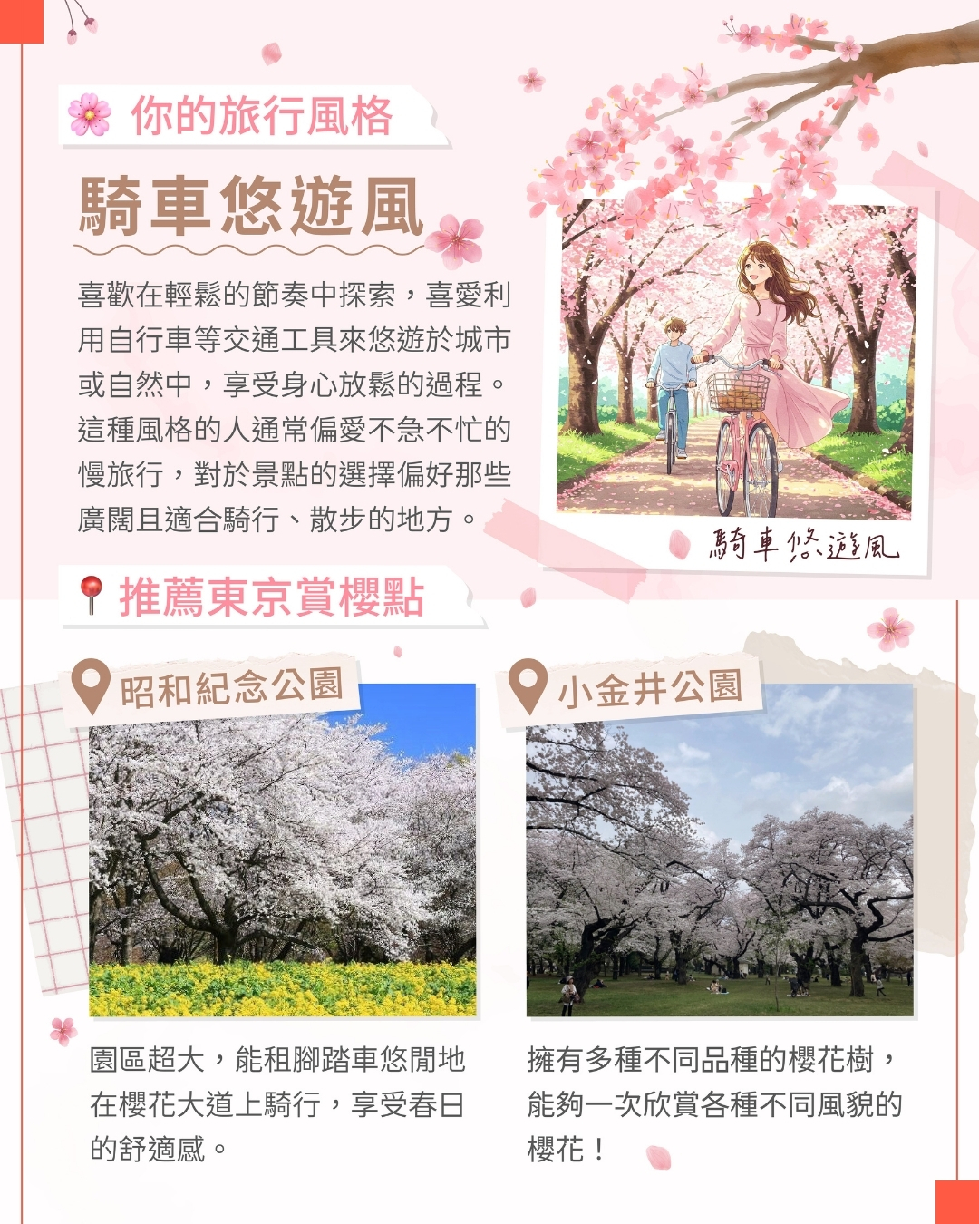 最近要去東京賞櫻的人快來!究竟要去新宿御苑、目黑川、六本木還是哪個勝地感受浪漫的粉紅魅力?請根據直覺選擇你的旅行風格是「騎車悠遊風」、「品味美食風」、「攝影愛好風」、「浪漫夜賞風」或「輕鬆休閒風」,為你推薦最適合的賞櫻景點!