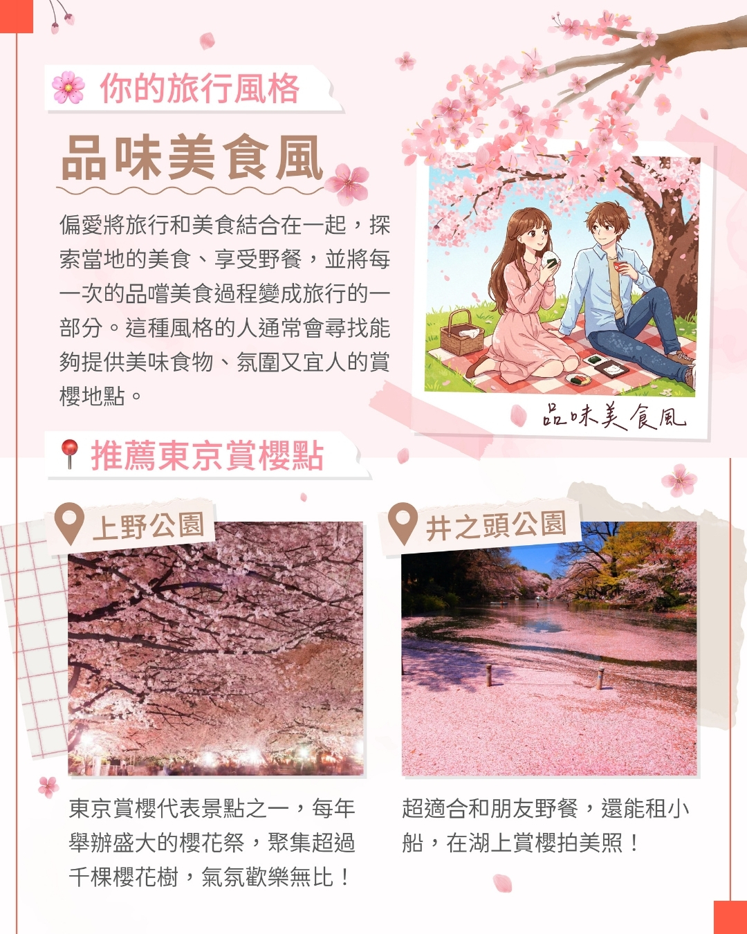 偏愛將旅行和美食結合在一起,探索當地的美食、享受野餐,並將每一次的品嚐美食過程變成旅行的一部分。這種風格的人通常會尋找能夠提供美味食物、氛圍又宜人的賞櫻地點。