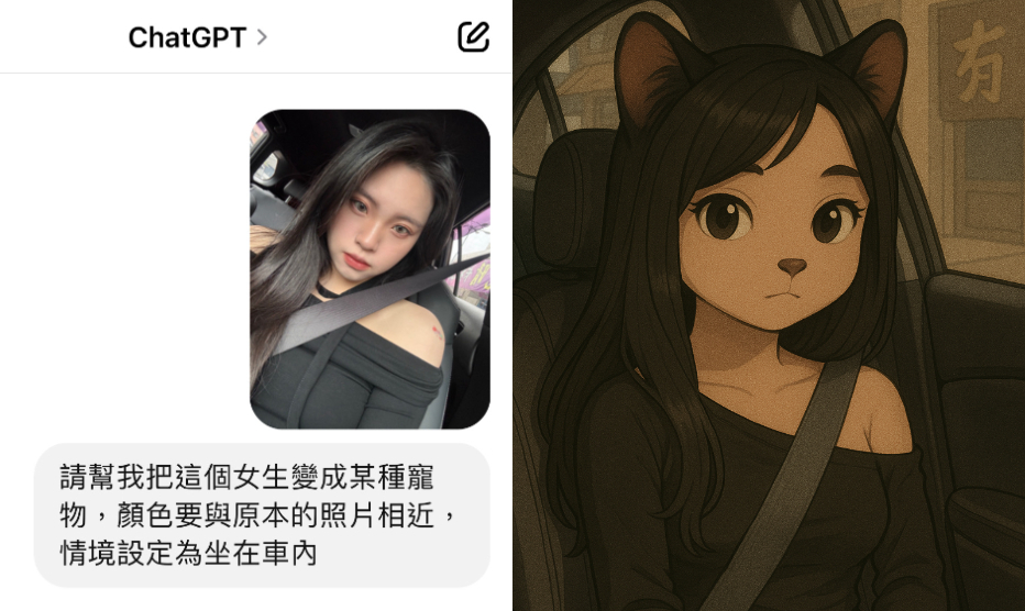 既可以將動物變成人,那當然也可以將人變成動物的形象啦!然而向ChatGPT下指令時,建議可描述一下顏色、場景設定,例如:「顏色要與原本的照片相近,情境設定為坐在車內」秒變《貓的報恩》!但也可能會出現違和感的圖片,得再下指定修改。