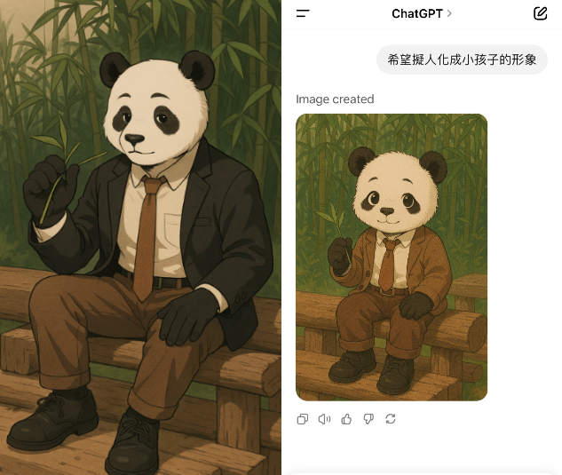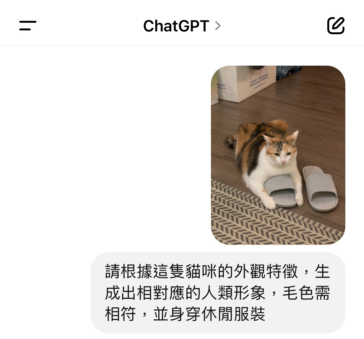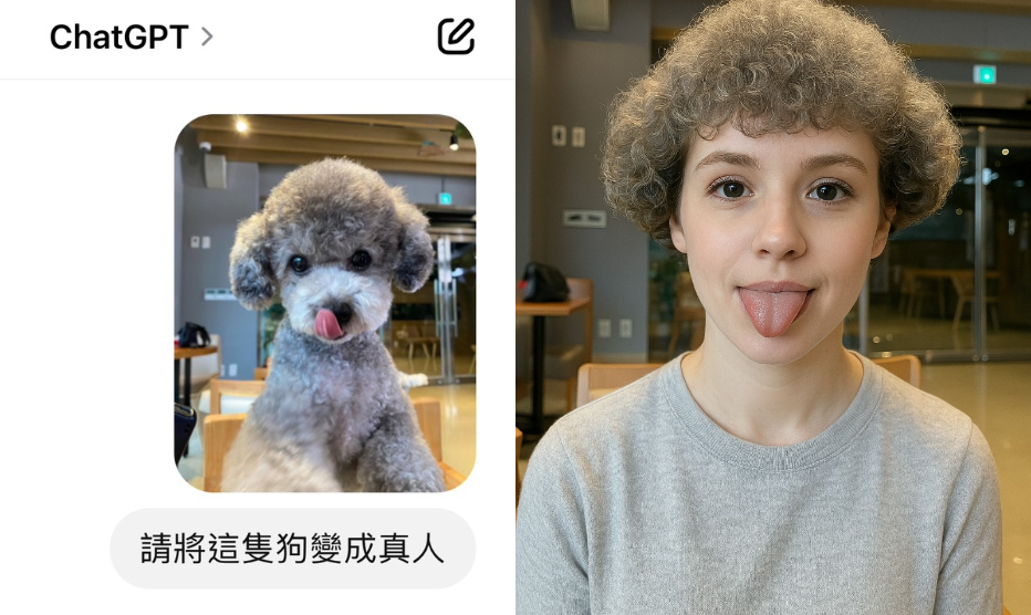 將自己的毛孩或動物圖片上傳至ChatGPT-4o聊天室,並寫道:「請將這隻狗變成真人」,等待一下後就會生成出毛髮、動作、五官等特徵相似的人物。若只是想將動物擬人化,則下「請生成擬人化圖片」指令,就會變成動畫風格~還可針對細節修改,非常可愛!
