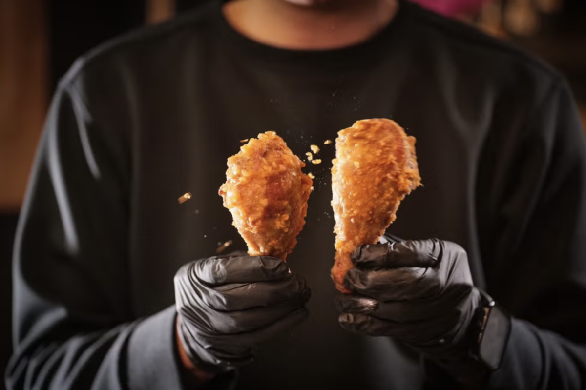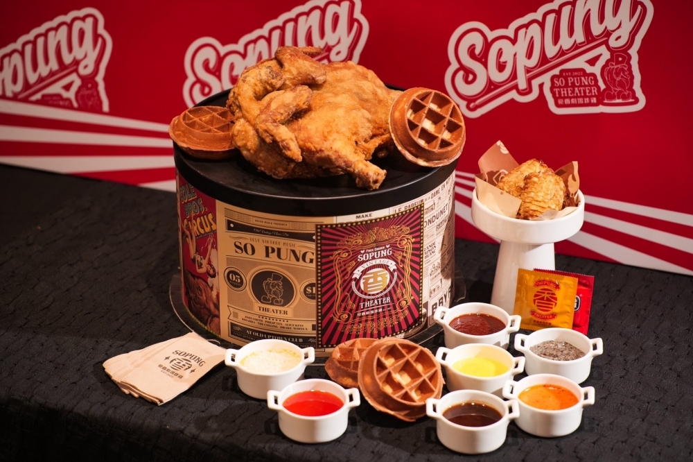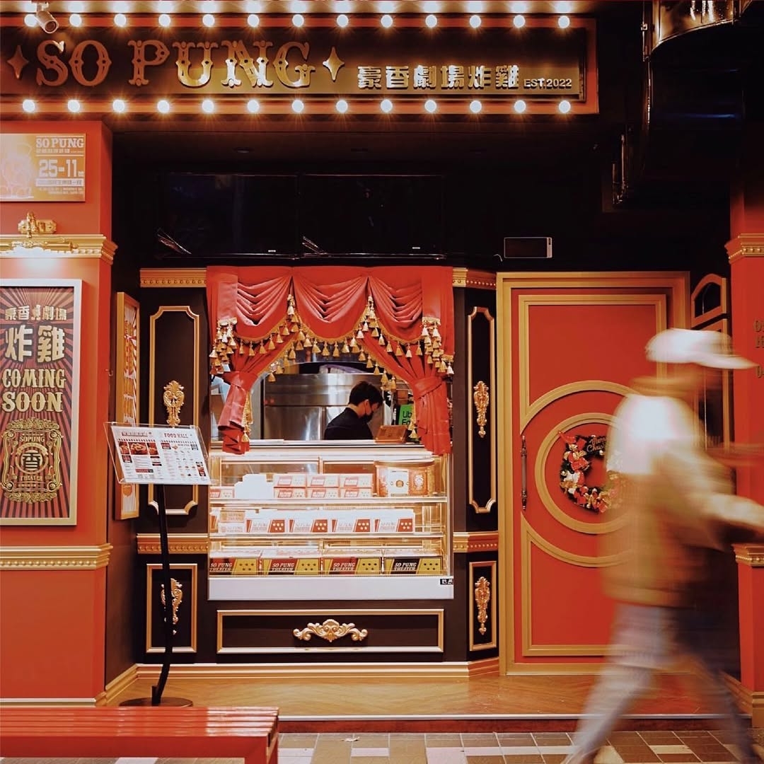 將炸雞與劇場元素結合,豪香劇場炸雞店面以紅、黑、金色調為主視覺設計,包含劇院風招牌與當燈光,彷彿來到百老匯後台。餐點命名也融入小巧思,像是「模特雞塊」、「香雞秀導」、「花旦豆腐」等等,讓前來大嗑美食的饕客們感受視覺與味覺的戲劇張力。