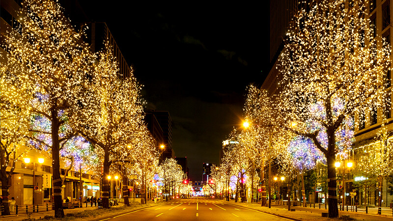 首先最引人注目的,就是貫穿大阪市中心的「御堂筋彩燈」,原本是聖誕檔期才會出現的夜間奇景,如今從阪神前交叉路口延伸到難波西口交叉路口,全線點燈一覽無遺。燈光設計呼應季節色調,每段道路都有不同的色溫與氛圍,讓人彷彿走進了一場光之漫遊。