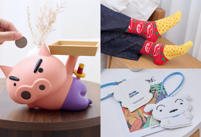 實用小物則有肥嘟嘟左衛門存錢筒、零錢包附購物袋與小白卡套,樂趣與功能性兼具。日常配件包括彩色襪子、拖鞋、大容量包包等等,讓小新元素輕鬆融入日常穿搭~若購買指定彩妝商品滿788元,還可獲得超萌手拿鏡,有小新、小白兩款。