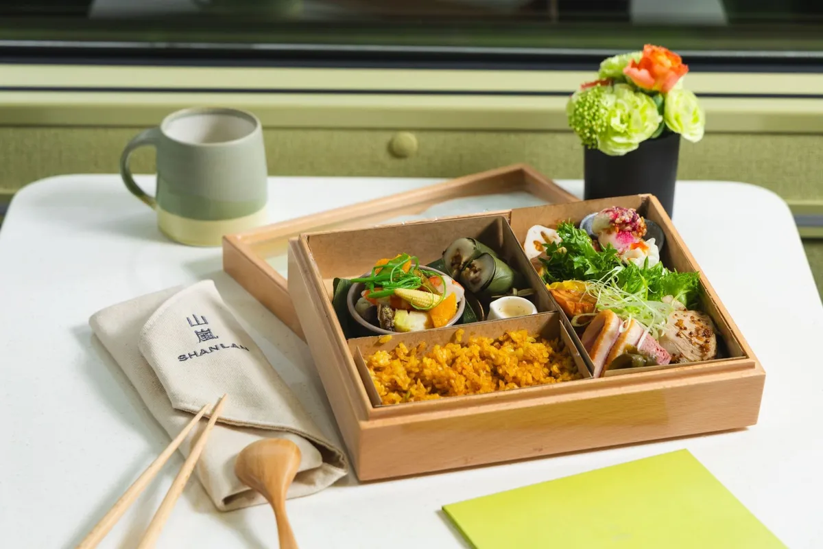 來份豐盛的鐵路便當是鐵道旅行的靈魂之一,特邀曾獲得世界名廚錦標賽雙料冠軍的花蓮主廚「葉志龍」設計,以6大主題呈現特色料理,菜色包含剝皮辣椒鴨捲、原住民傳統美食阿粨等等。甜點則與「九日良田」合作,推出水羊羹、日式和菓子,搭配花蓮蛇紋岩製成的餐盤盛裝。