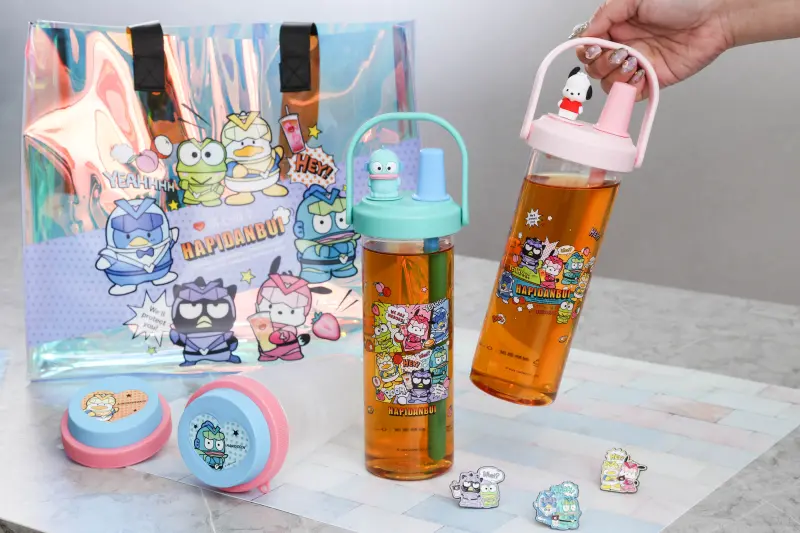 清心福全與三麗鷗男團「HAPIDANBUI」最新一波聯名,除了2款限定環保瓶,即日起還有透明鐳射炫彩提袋,設計以HAPIDANBUI合體為主題;而5/9起還有3款精緻胸針、5/16起消費滿額再送HAPIDANBUI貼紙一份!