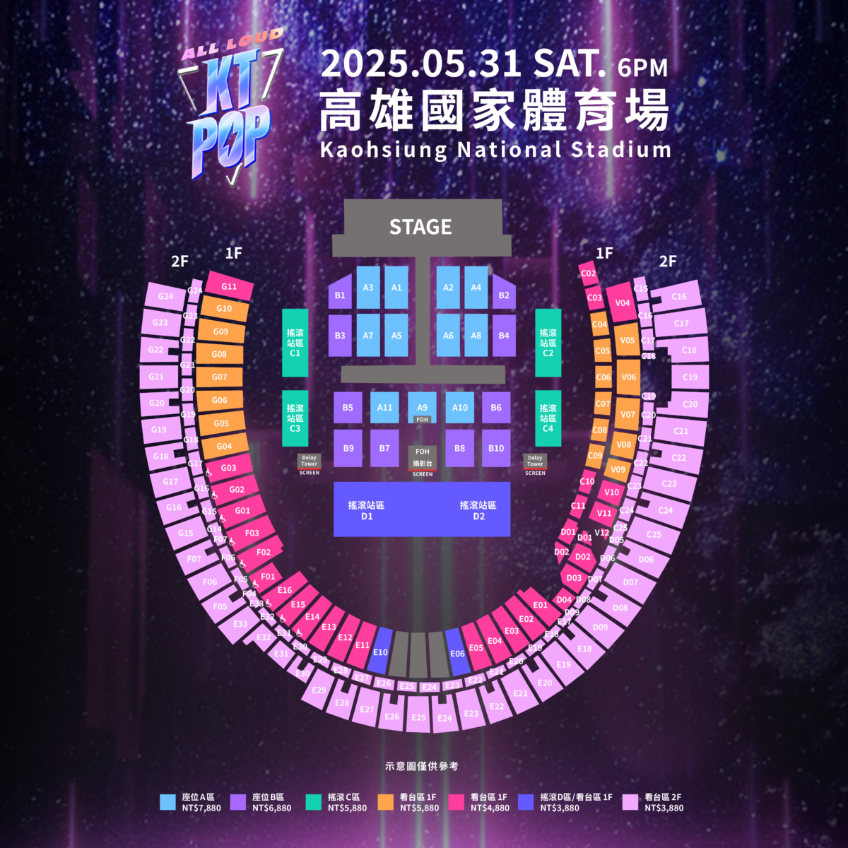 KT POP在高雄世運主場館的演唱會分為7,880元、6,880元、5,880元、4,880元與3,880元共五種票價,獨創「髮香區」60分鐘彩排福利,7組明星都看得到!另外還能抽簽名拍立得、海報與合照福利,又是考驗大家人品的時候啦~
